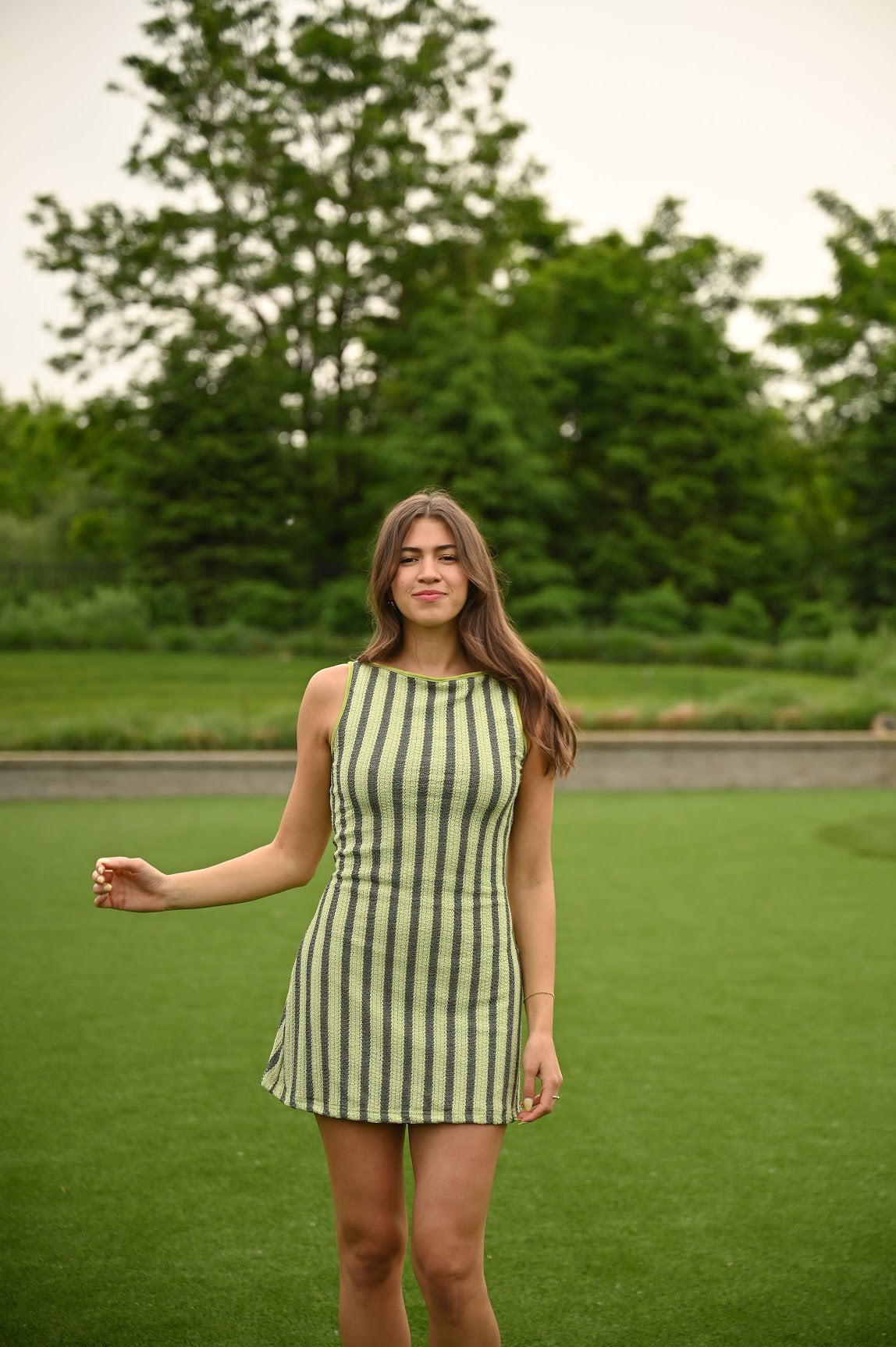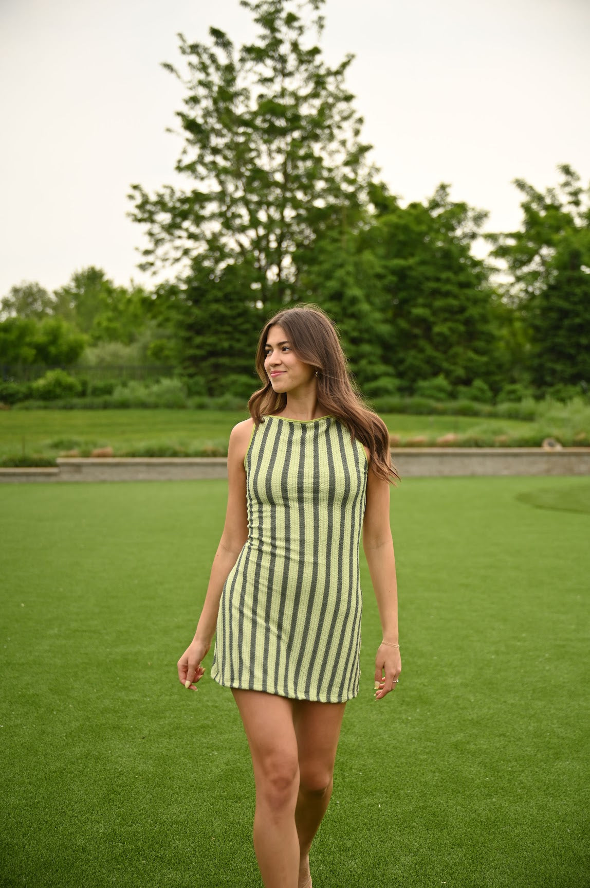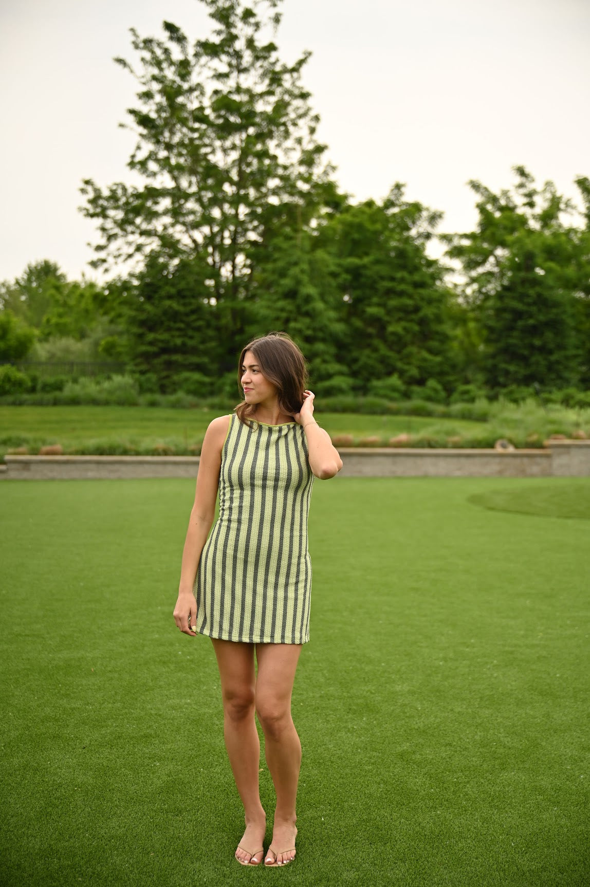 Go bold with our Full Dress! This stripe mini dress in green is the perfect statement piece for any occasion. Stand out in style and make a fashion statement with this eye-catching dress. It's time to dress up and have some fun!