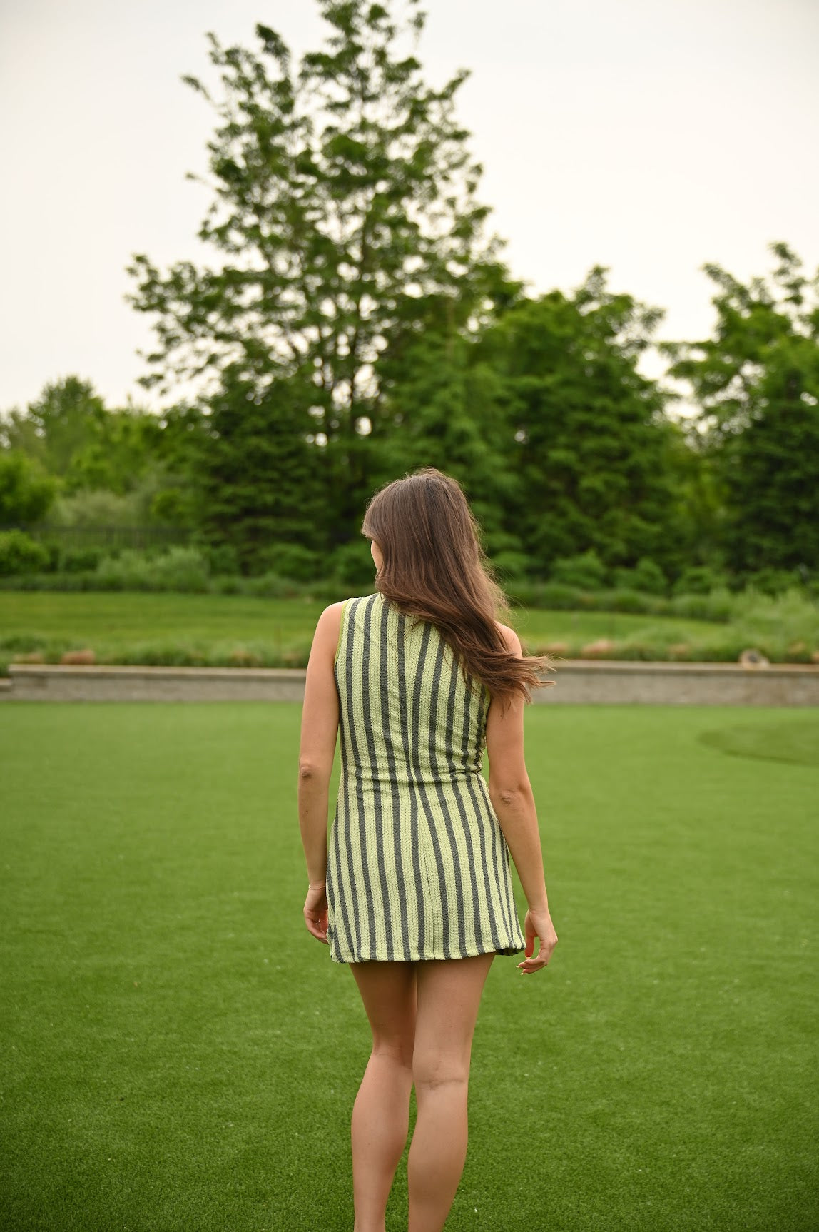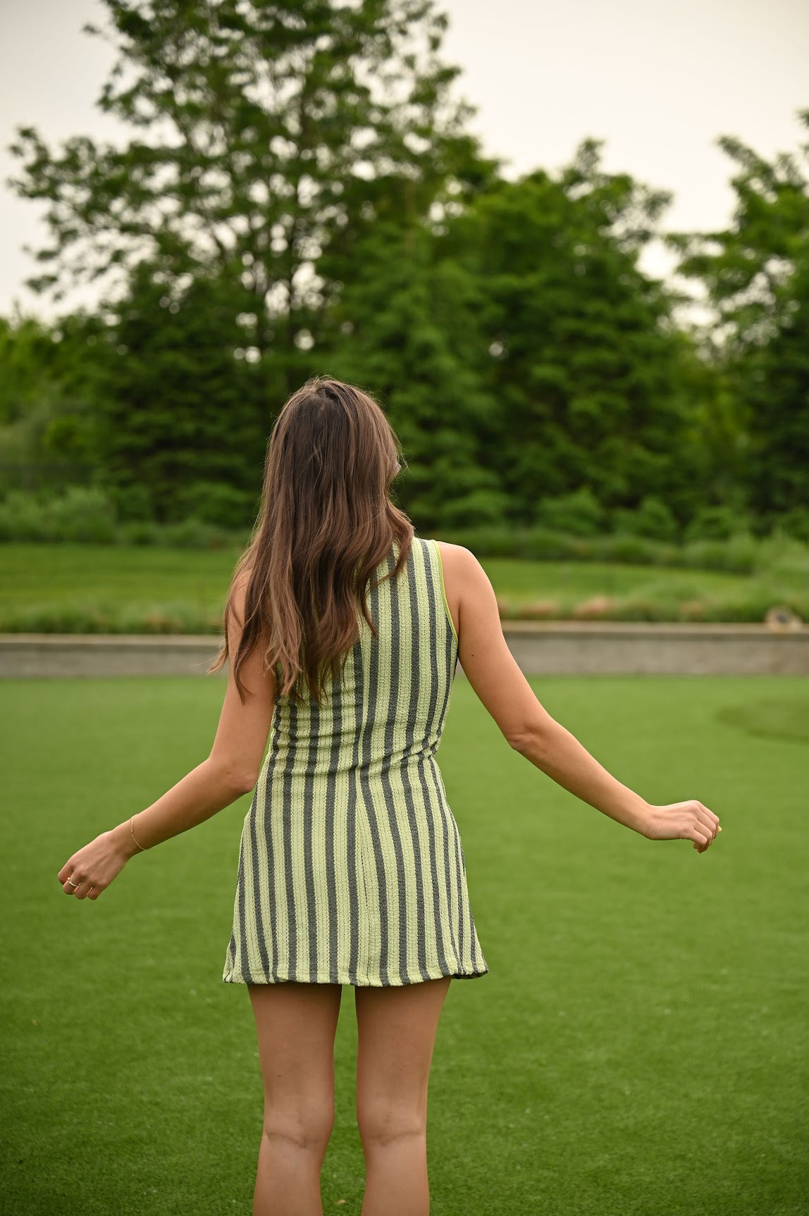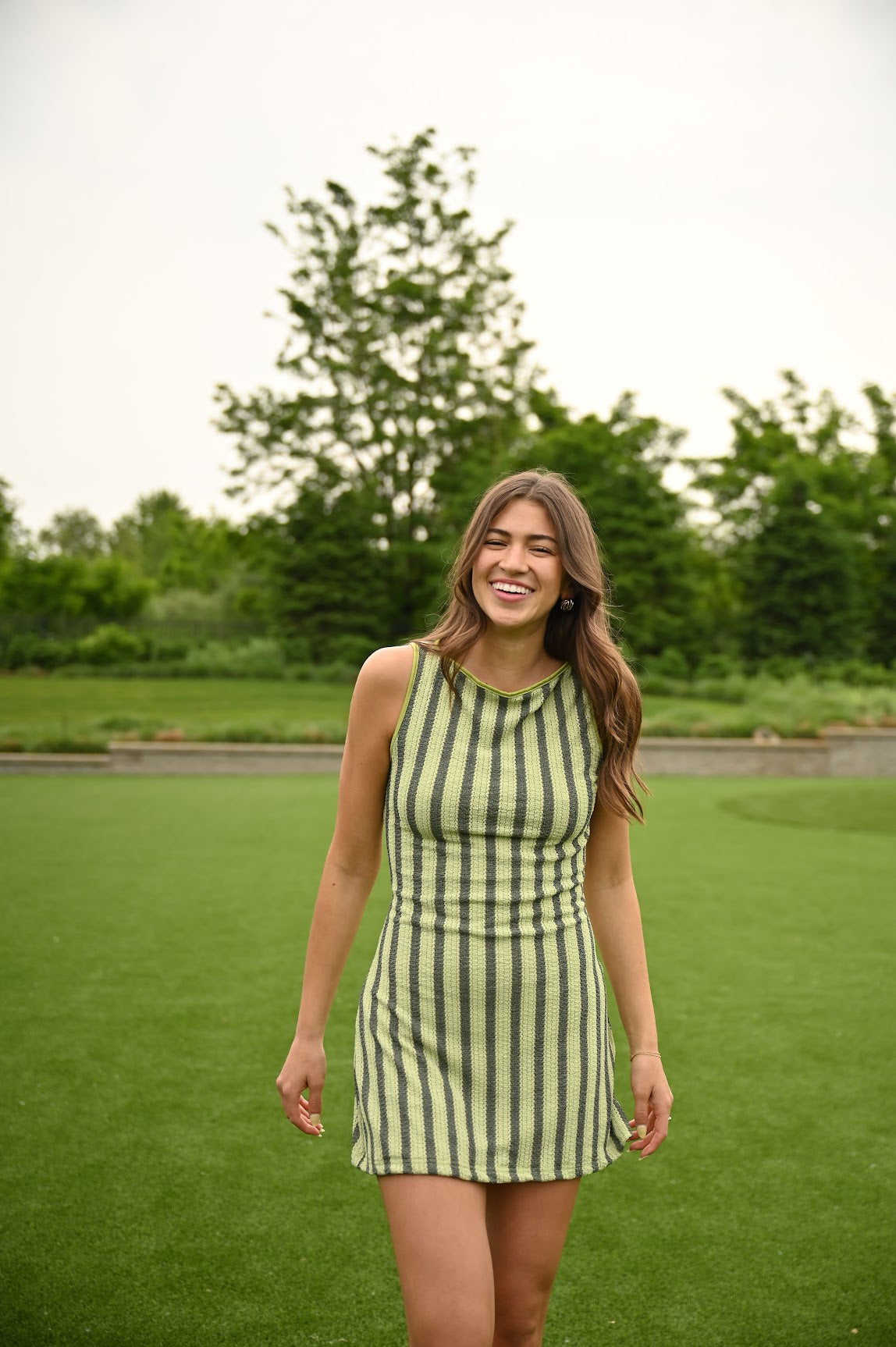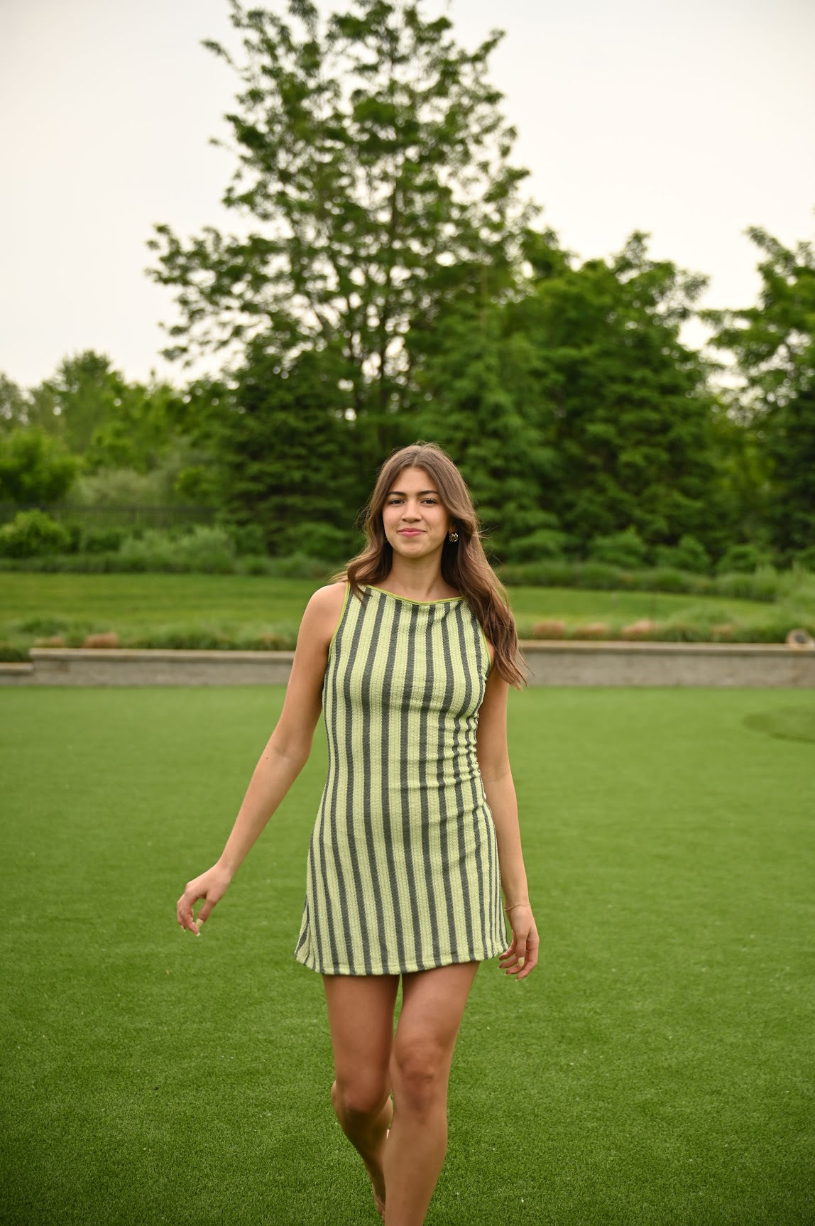 Go bold with our Full Dress! This stripe mini dress in green is the perfect statement piece for any occasion. Stand out in style and make a fashion statement with this eye-catching dress. It's time to dress up and have some fun!