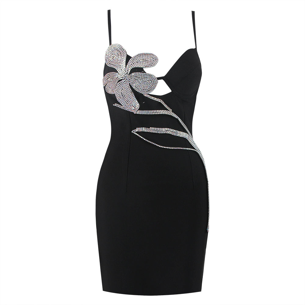 FUSAE Black Mini Dress with Crystal FLowER