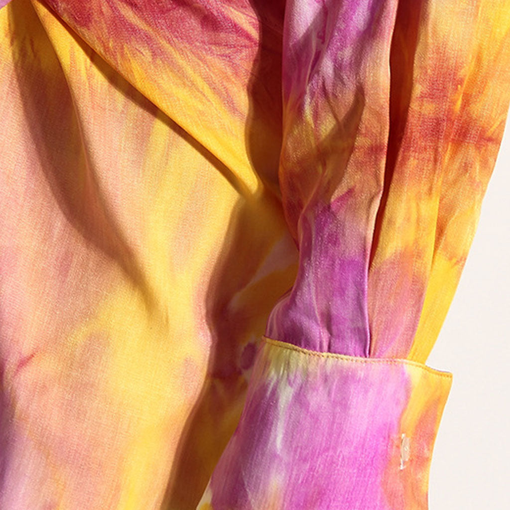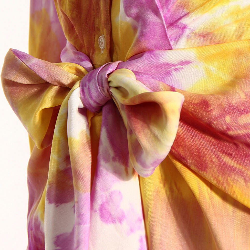 Multicolor Tie Dye Print Collared Long Sleeve Tie Front Button Up Mini Shirt Dress