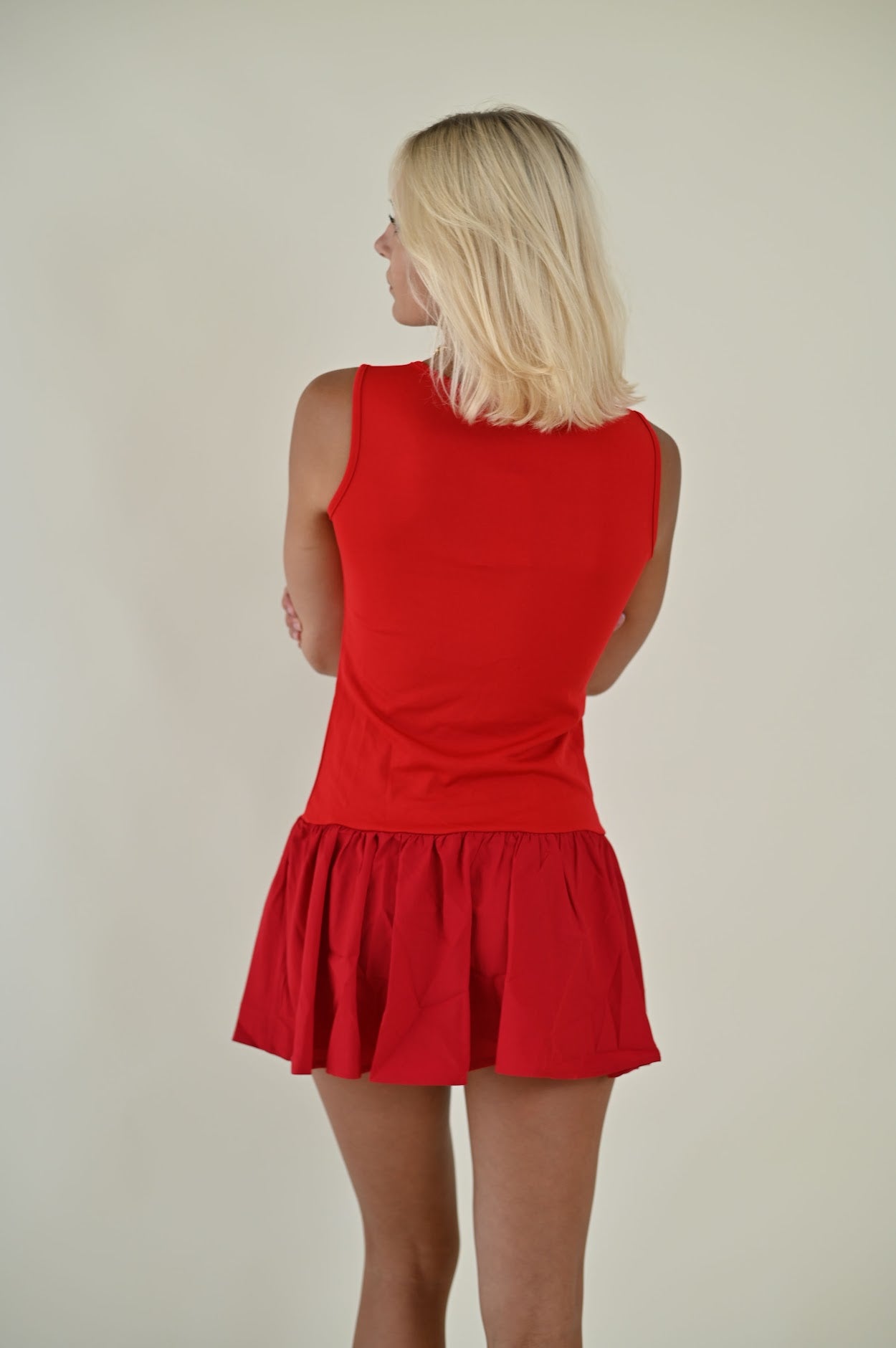Introducing the Naples Dress in a bold red hue. This designer favorite seamlessly combines solid color and sleeveless stitching for a unique and playful look. A must-have for any stylish lady! (double meaning intended)