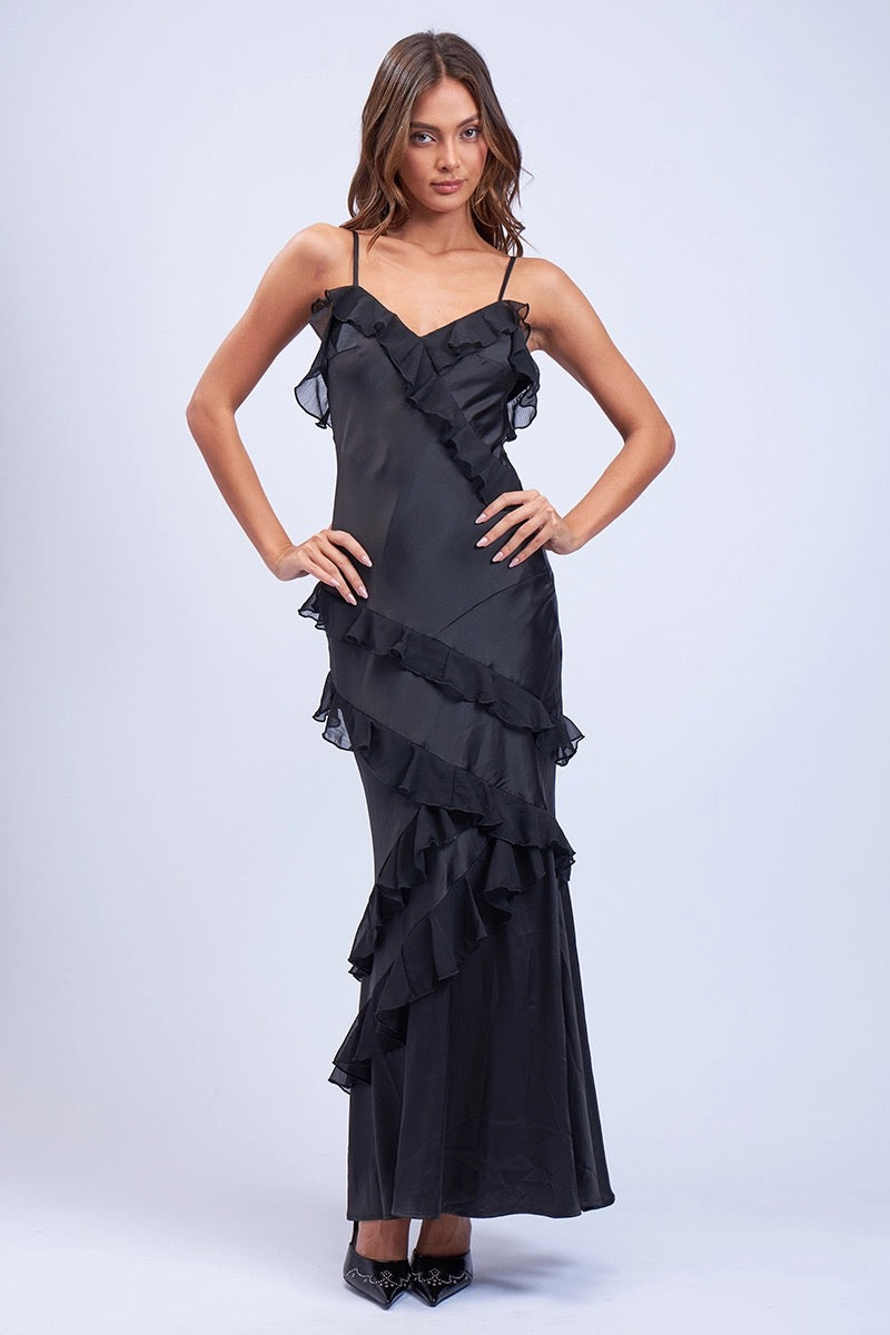 This black satin dress is perfect for a night out! With its sleeveless design and elegant ruffle trim, this maxi dress adds a touch of sophistication to any occasion. So go ahead, dance the night away in style!