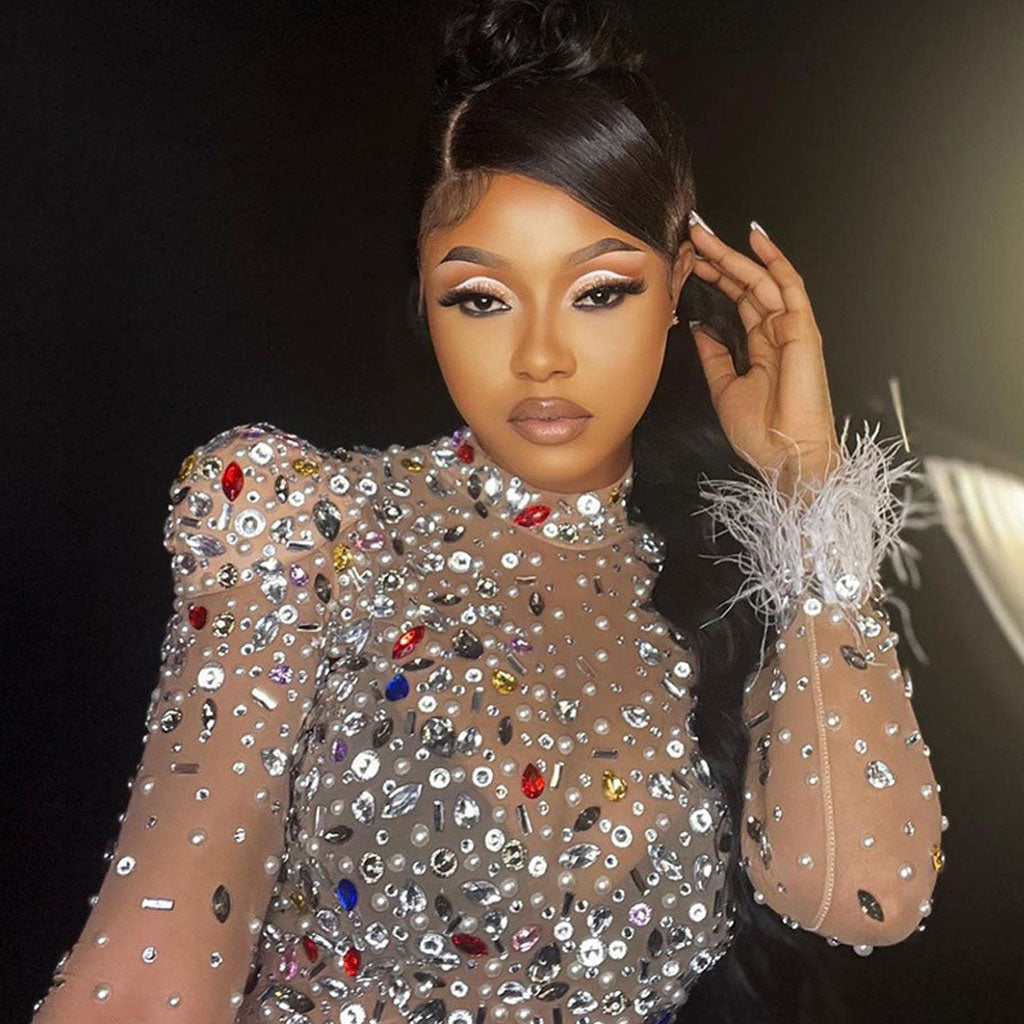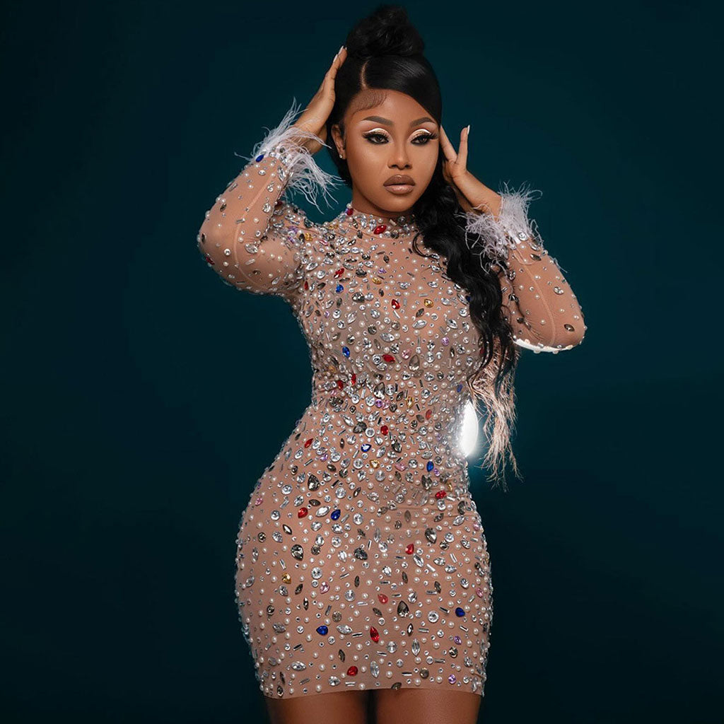 Ornate Diamante Sheer Mesh Mock Neck Feather Trim Long Sleeve Mini Party Dress