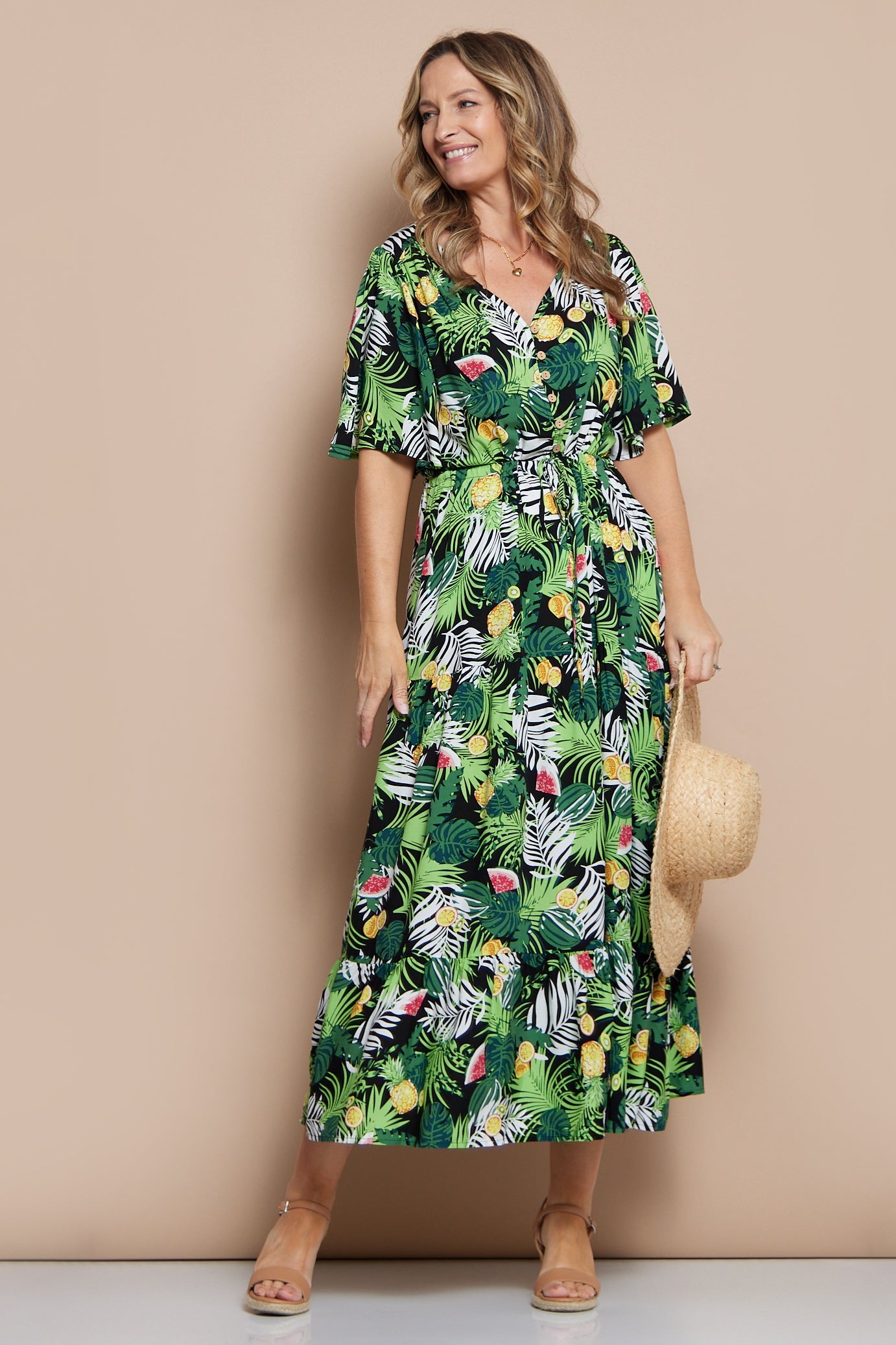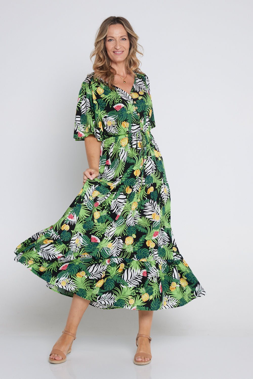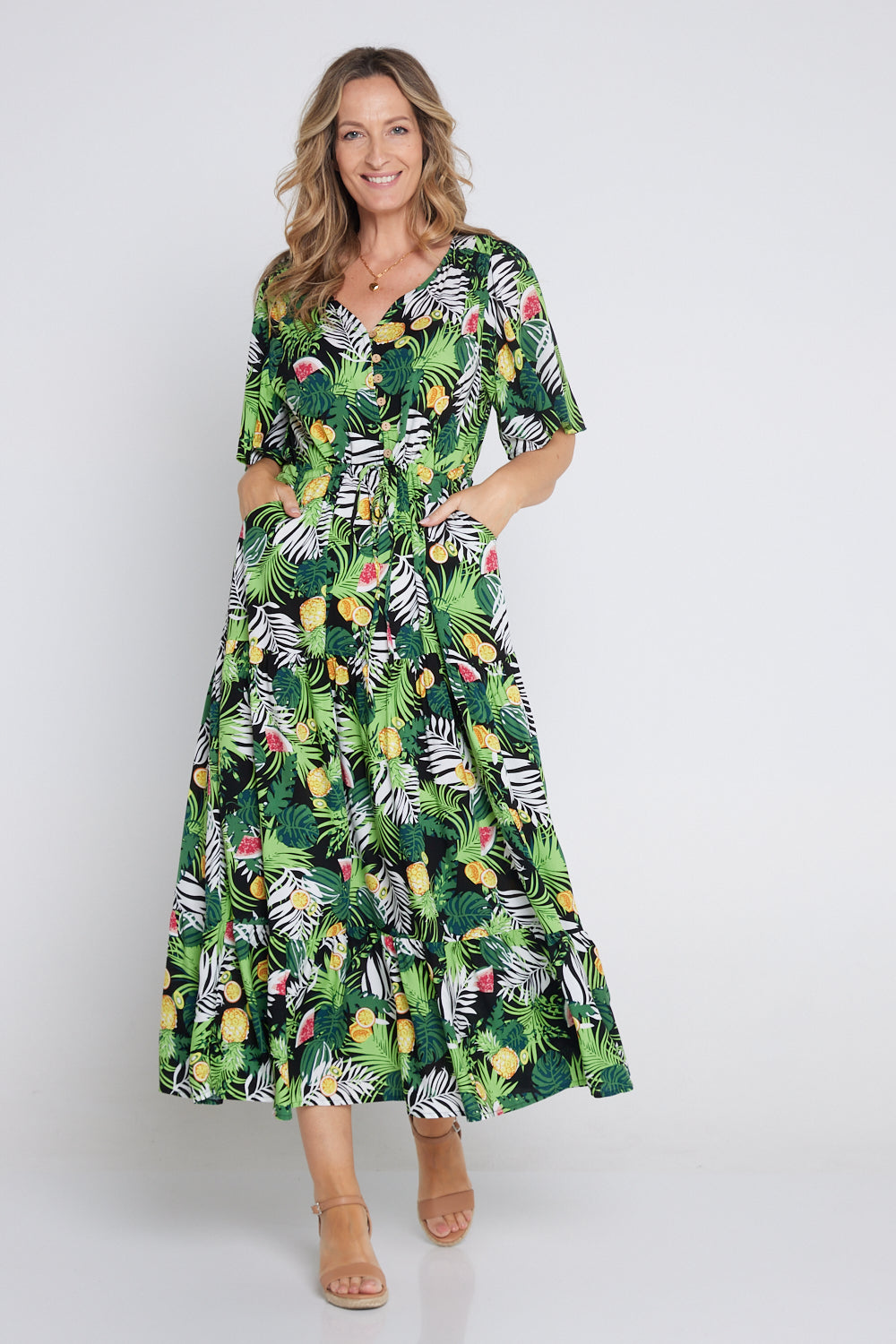 This new pattern is the epitome of summer, featuring lush tropical foliage and fruit, with bright pineapples, citrus and watermelon scattered amongst the leaves. Seeing this dress instantly transports us to a holiday by the beach.