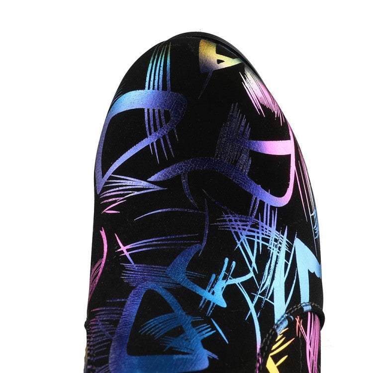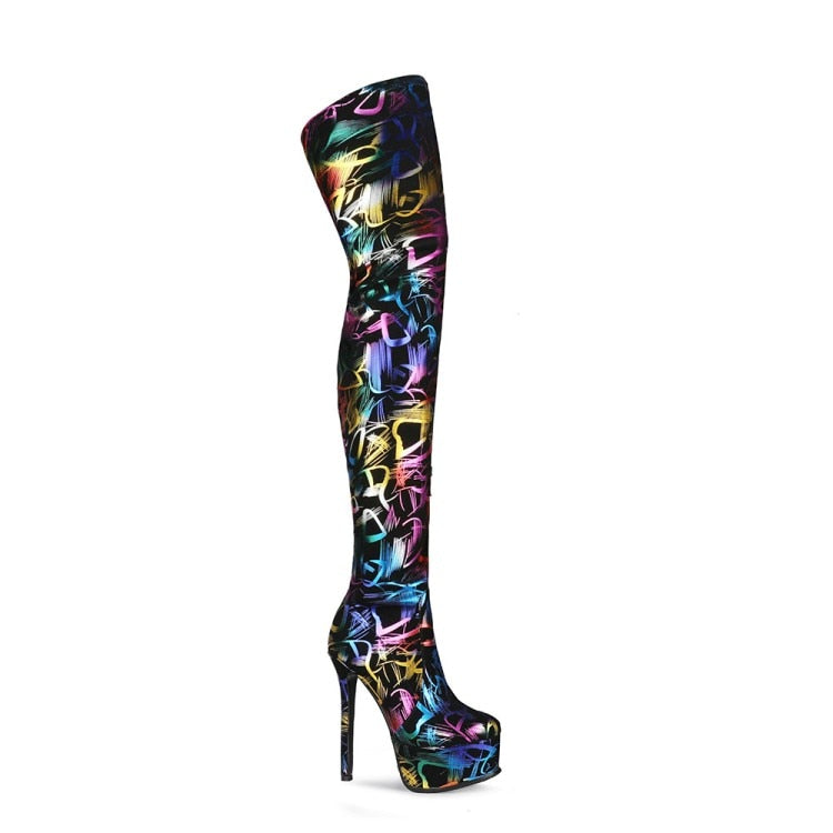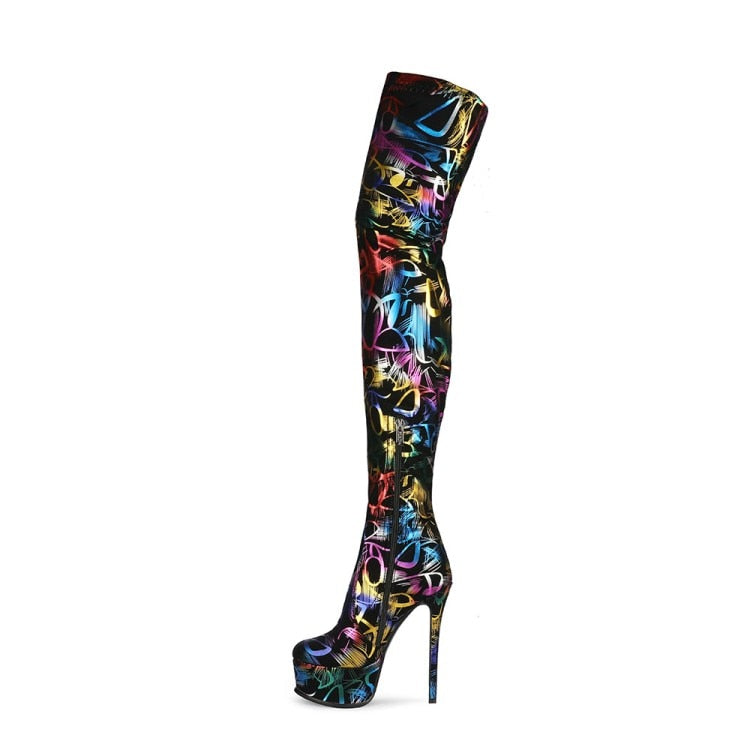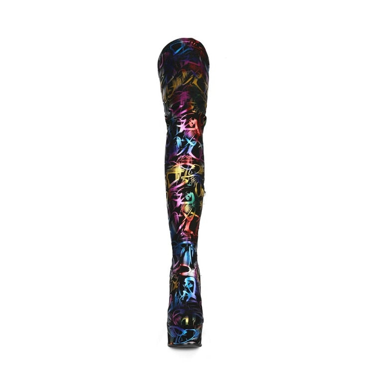Colorful Graffiti Prints on Black Over The Knee Boots Made From PU Leather with Platform, Thin Heels, and Zipper Closure