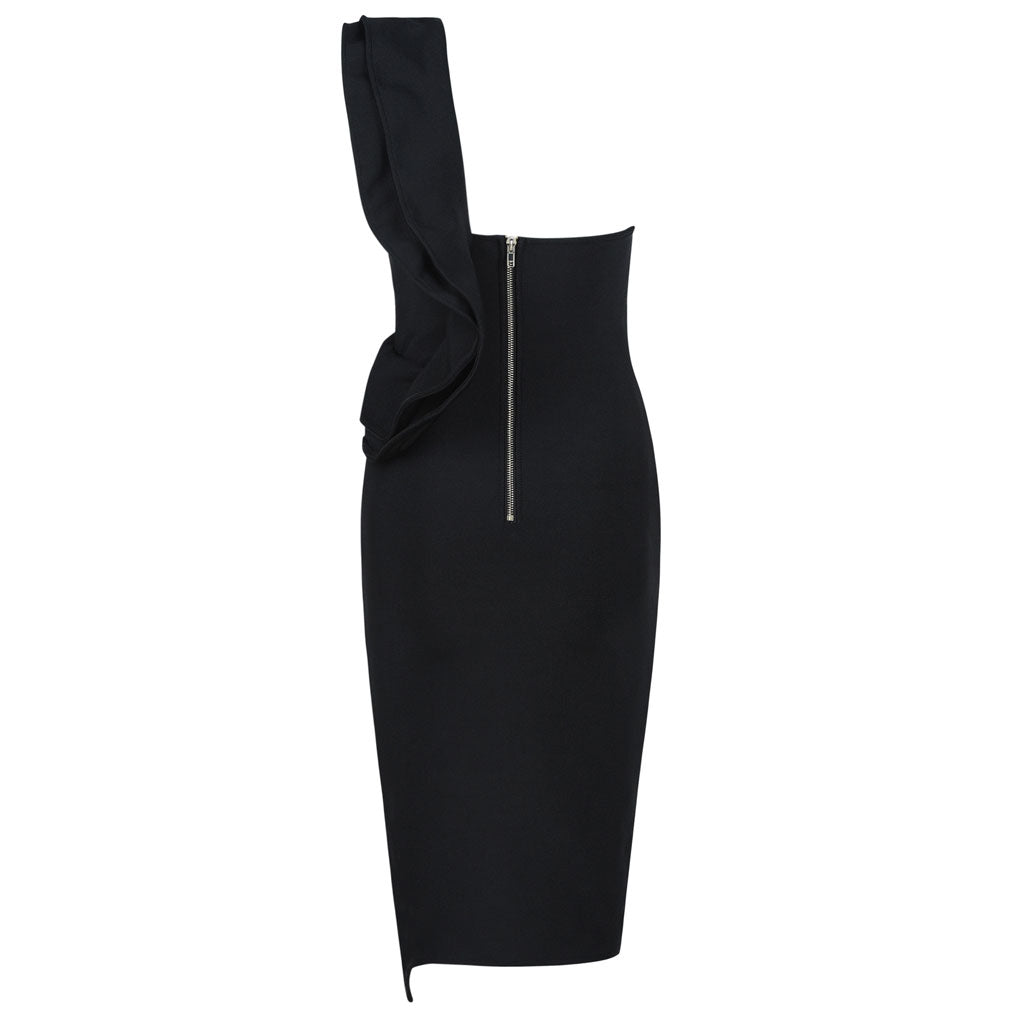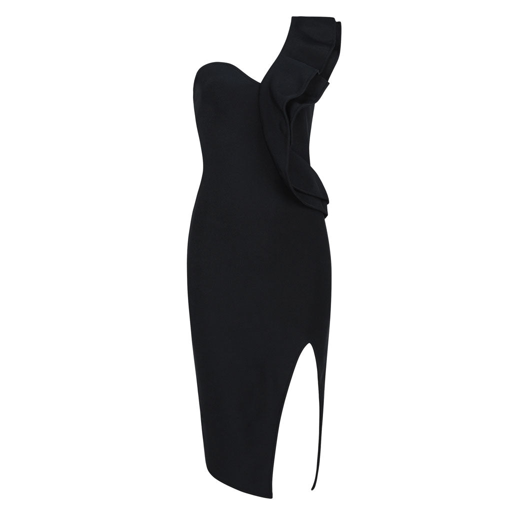 Ruffle One Shoulder High Slit Deep V Midi Party Dress - Black