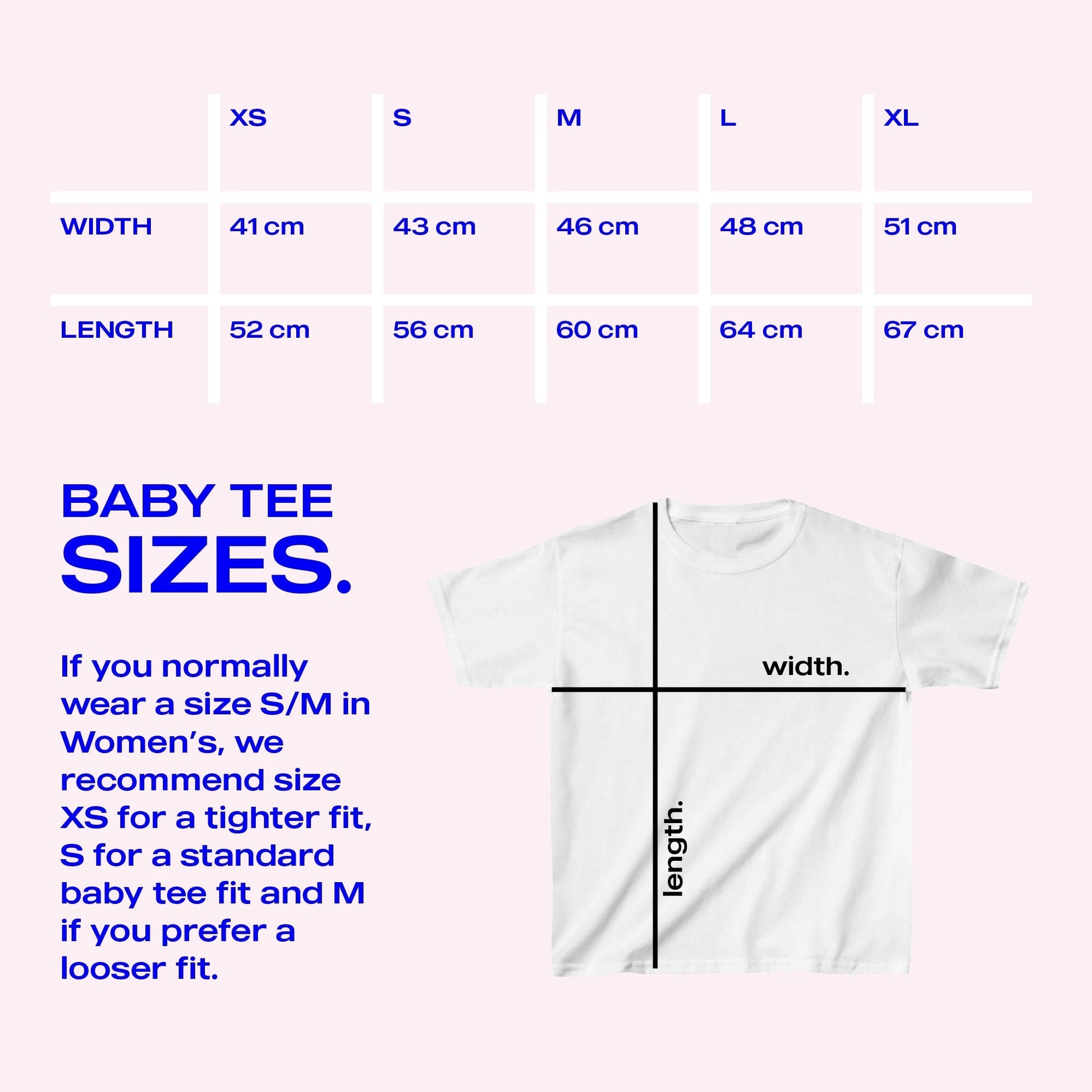 (please note these are 'baby tees' made for adults, meaning they fit slightly shorter on the arms and body than a standard t-shirt).