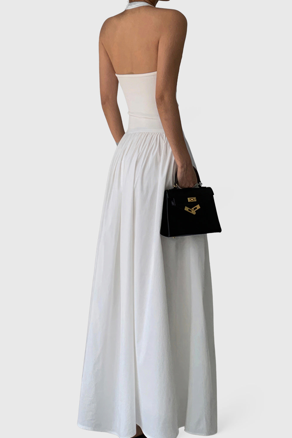 Midi dress with halter neck and round neckline. The upper part of the dress is stretchy.