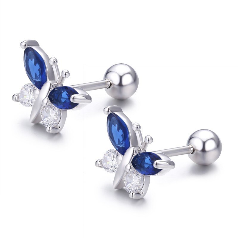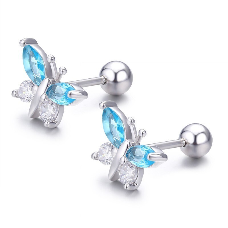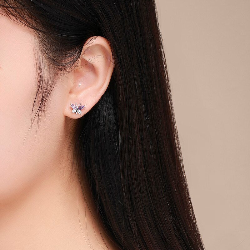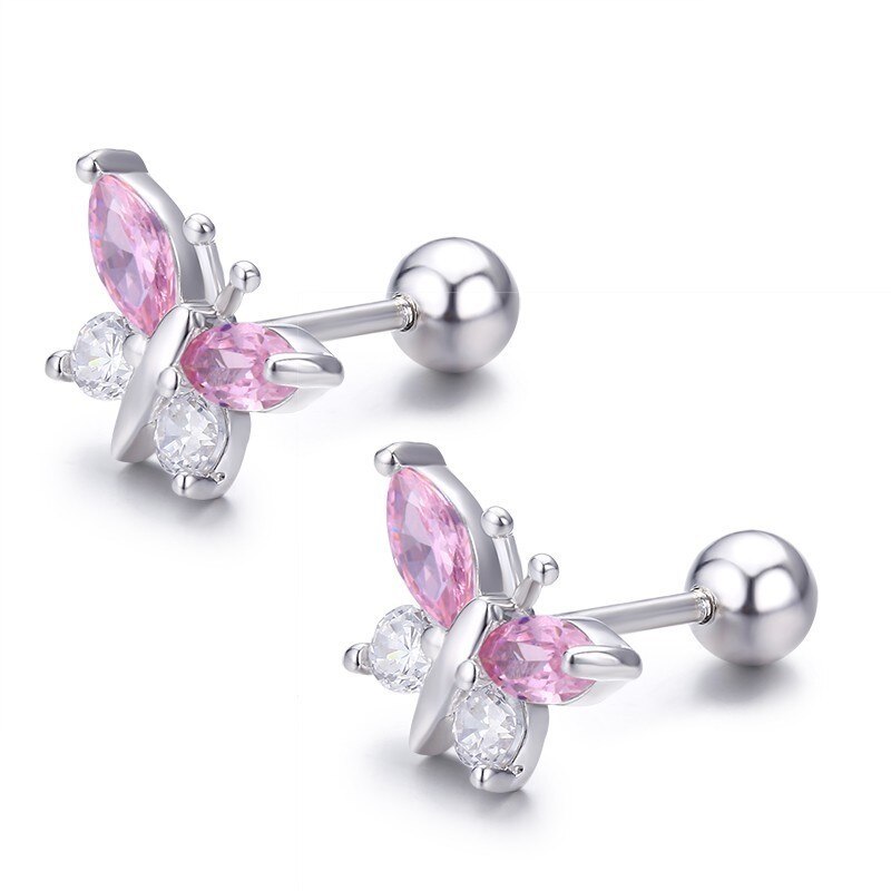Cute 925 Sterling Silver Butterfly Pink CZ Screw Back Women Stud Earrings