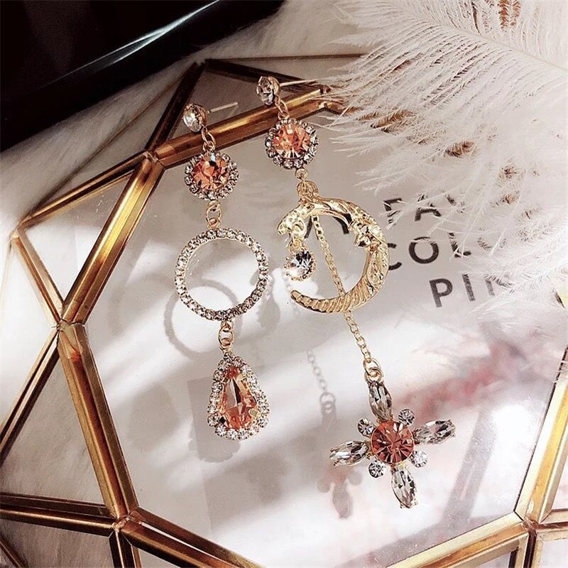 Korean Baroque Water Drop and Moon Circular Crystal Dangle Earrings