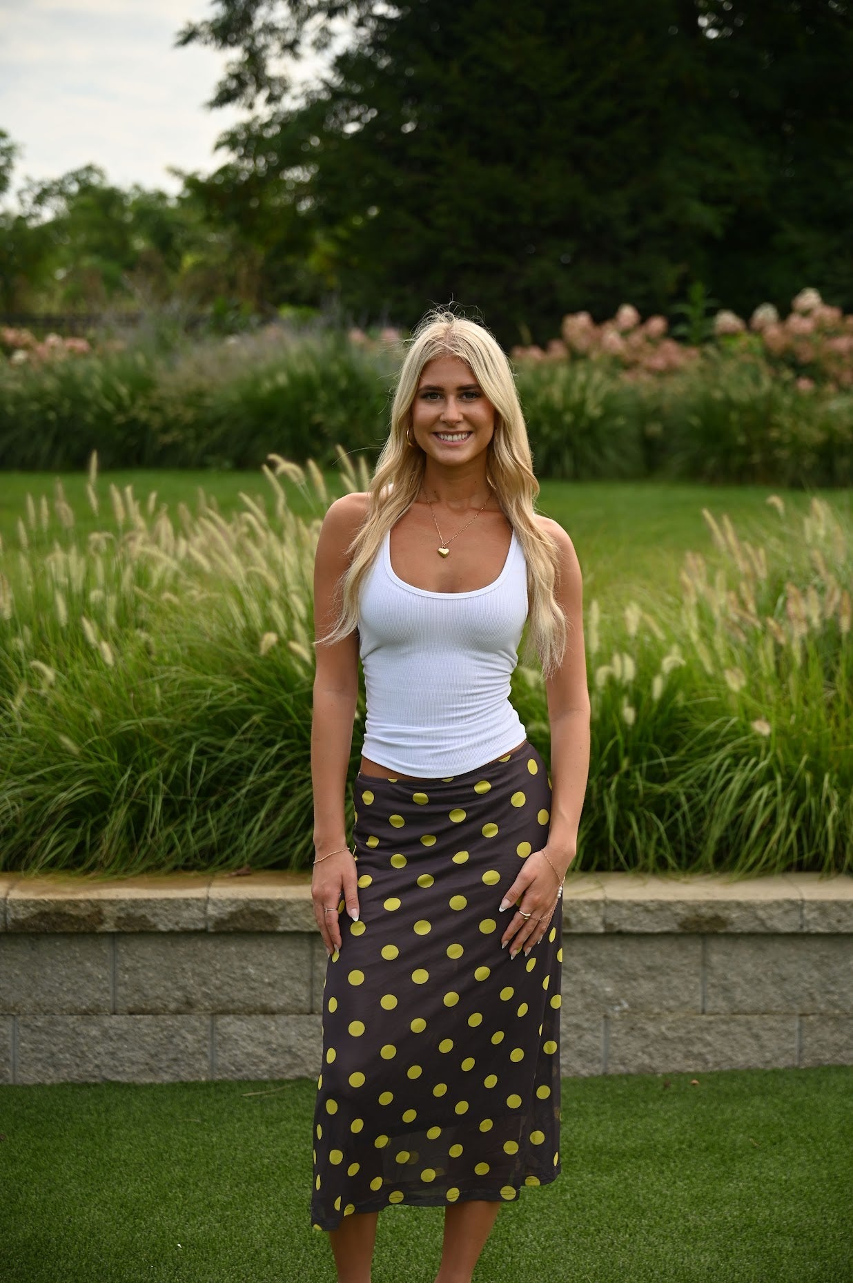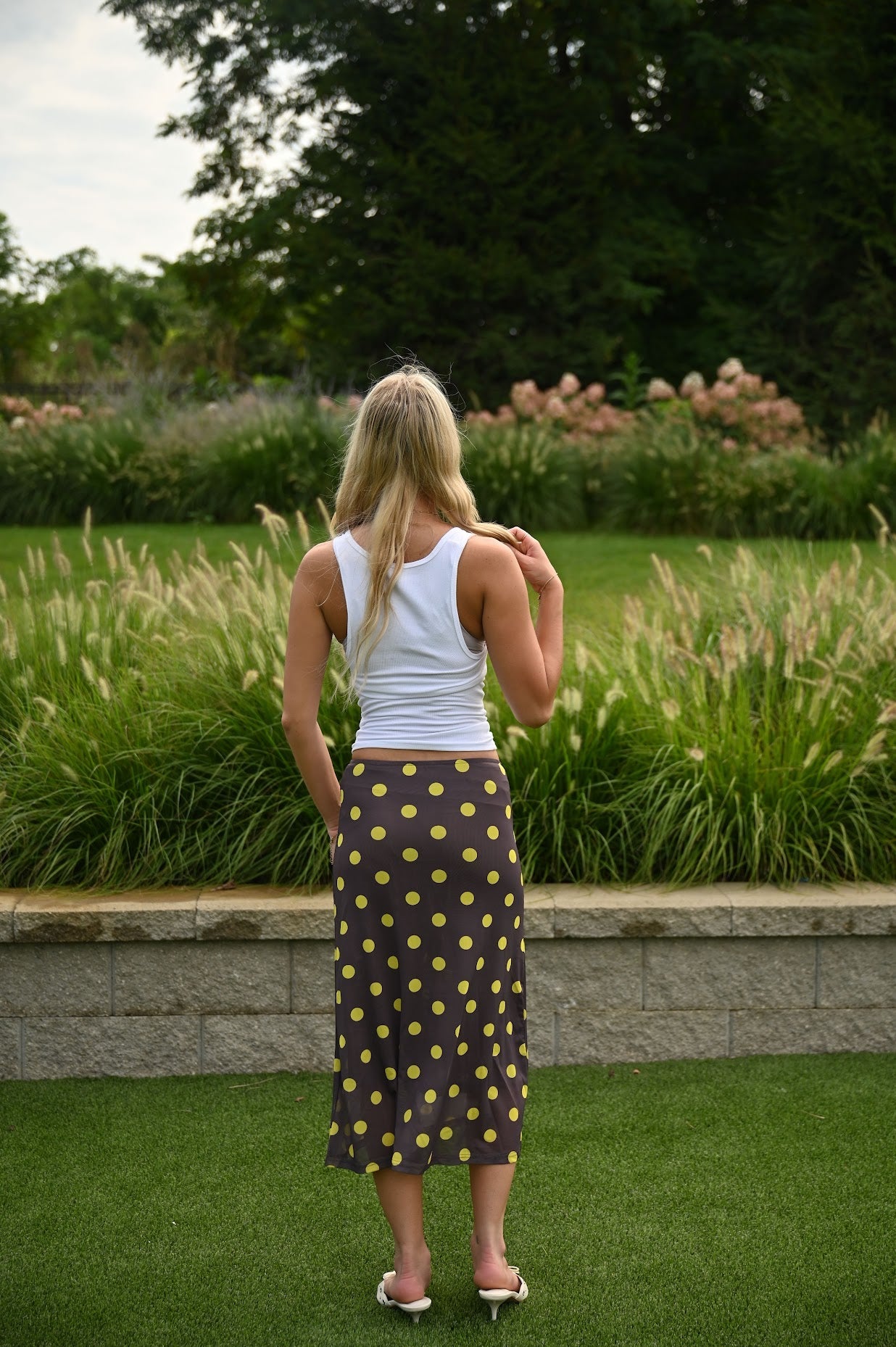 Bring a splash of sunshine to your wardrobe with the Bumble Skirt. This playful maxi features cheerful yellow polka dots dancing on a rich brown background, perfectly blending boldness and charm. Its flowing silhouette ensures comfort and effortless movement, making it an ideal choice for sunny days or breezy evenings. Pair it with a simple top to let this skirt steal the spotlight and add a joyful vibe to any outfit.