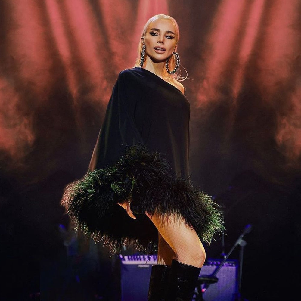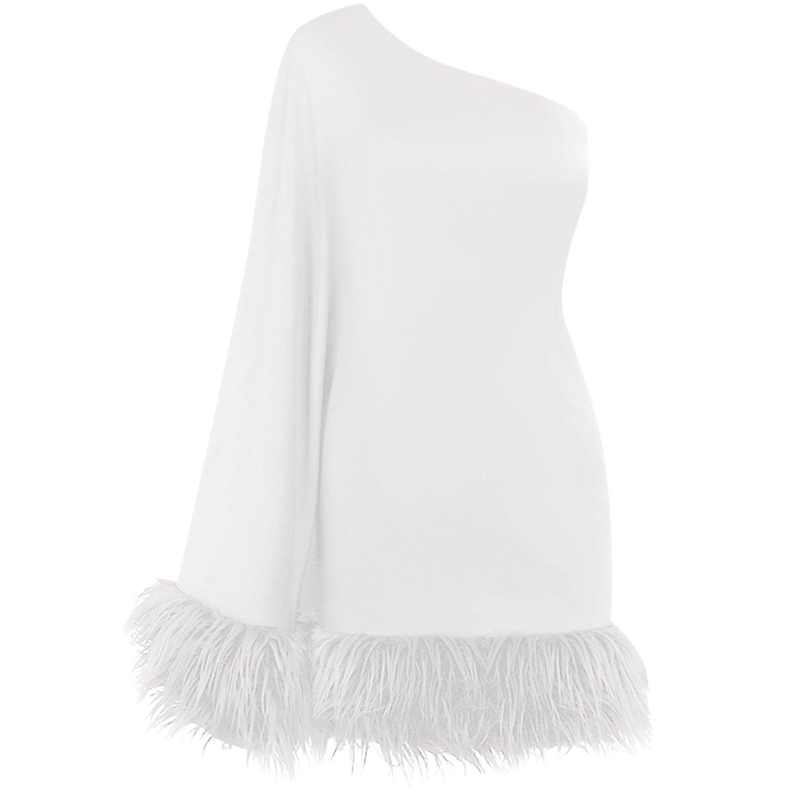 A Shared Secret Mini Dress is an elegant piece made from high-quality cotton. It features a solid design with one shoulder and is decorated with feathers. Available in black and white, this dress is perfect for any special occasion.