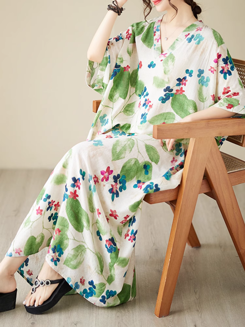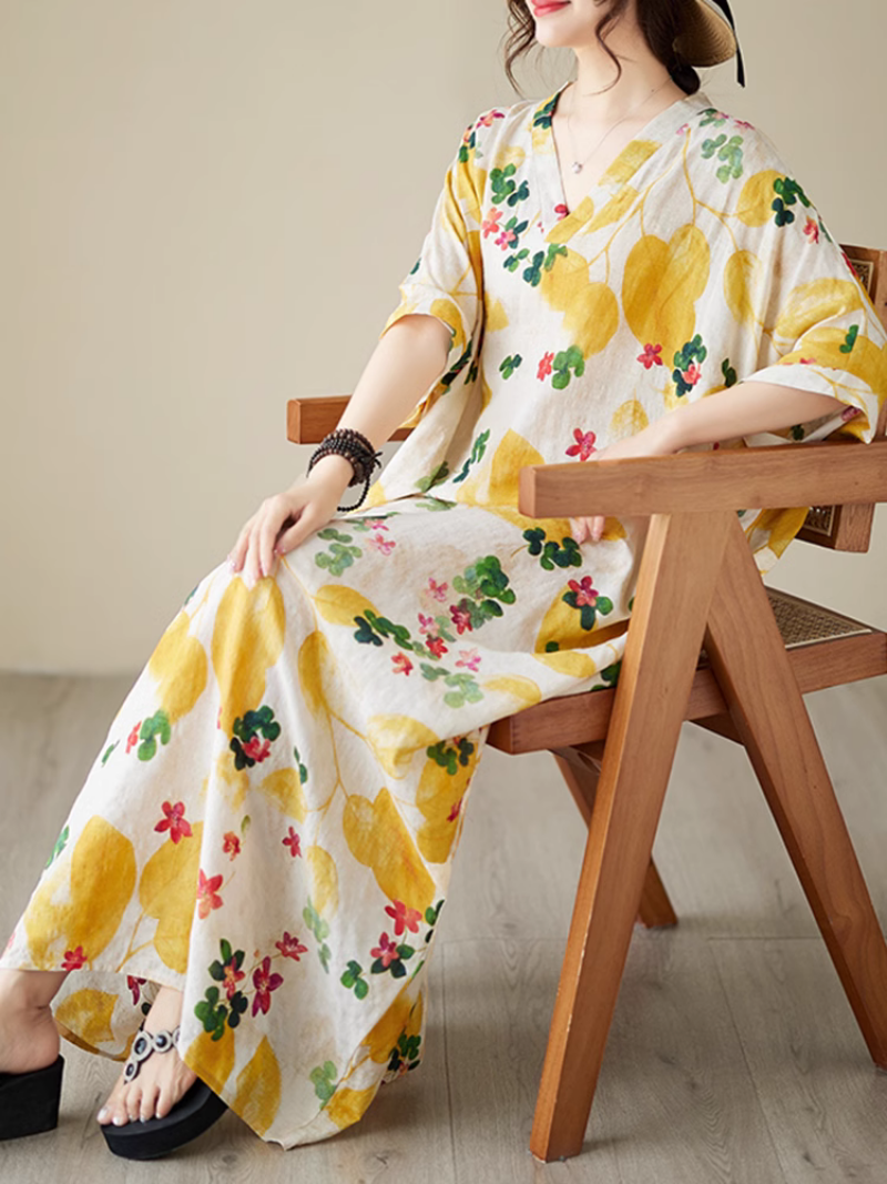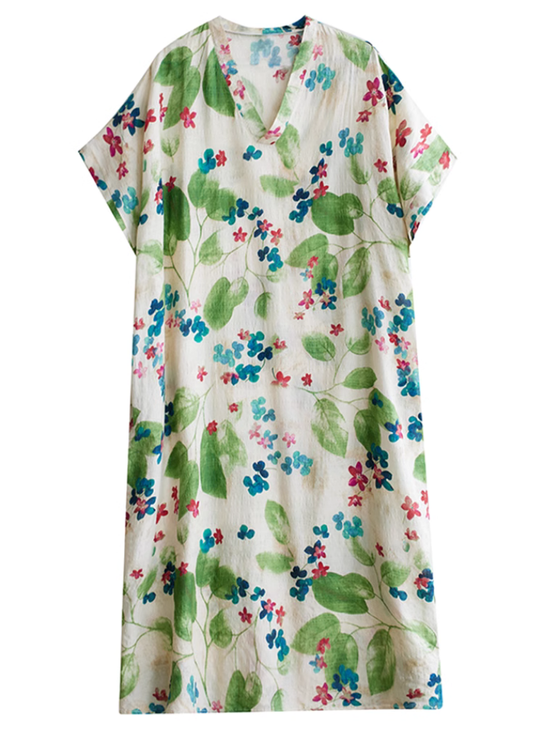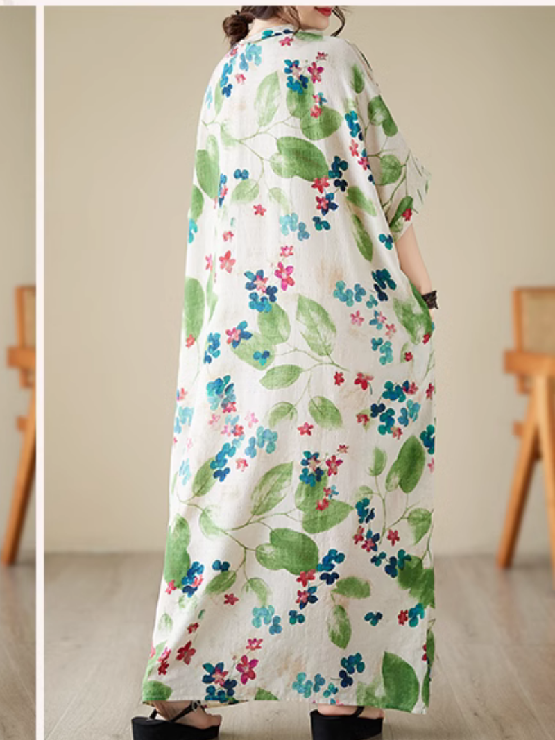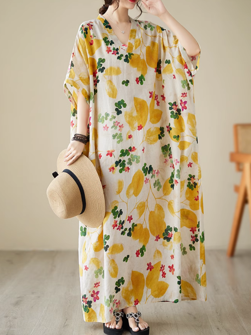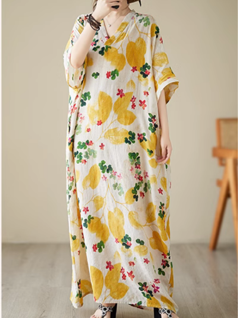 Embrace laid-back elegance with our Women's Pattern Beach Kaftan Dress. perfect for those sunny beach days. Crafted from a blend of cotton and flax. this dress offers a comfortable and lightweight feel. ideal for warm weather. The bat sleeve design adds a relaxed and breezy touch. while the V neck collar complements the beachy vibe. Available in two delightful colors - green and yellow - you can choose the one that resonates with your style. The Free Size ensures a comfortable fit. with a bust circumference of 158cm and a length of 133cm. Step into this chic kaftan dress and effortlessly exude charm and sophistication at the beach or any casual outing.