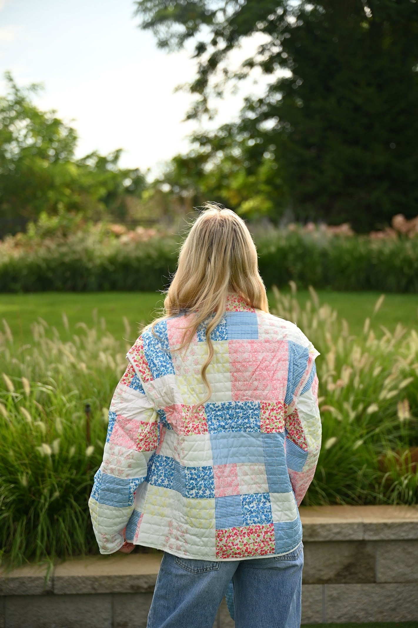 Introducing the Coastal Grandmother Jacket – a timeless piece combining comfort with classic style. This quilted jacket features a patchwork of serene pastels and delicate floral prints, evoking the cozy elegance of a seaside retreat. Its relaxed fit drapes gracefully, perfect for breezy evenings or leisurely weekends. Versatile and sophisticated, this jacket pairs effortlessly with everything from linen trousers to simple dresses, enhancing any ensemble with its soft hues and classic design. Embrace the effortless charm of coastal living with this exquisite, single-breasted cardigan. Ideal for any wardrobe, it promises both style and comfort. This jacket's sleeves zip on and off to make it a vest as well.