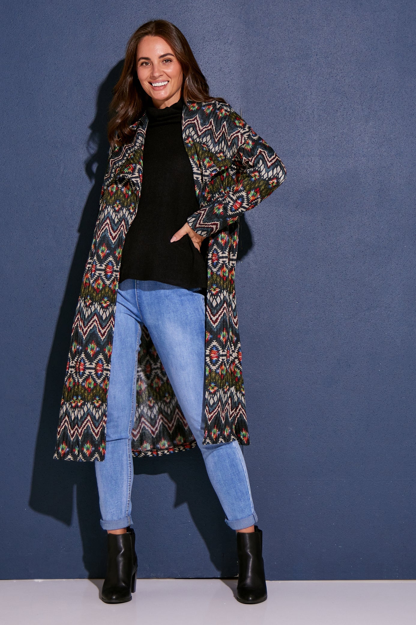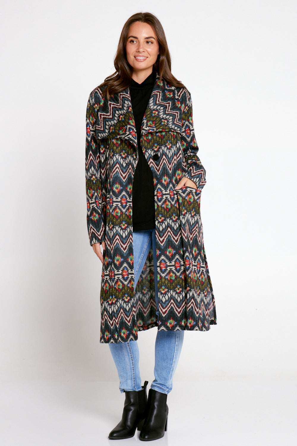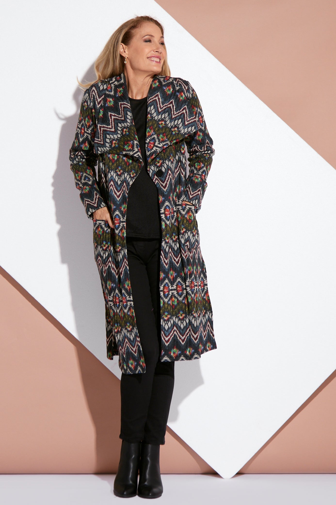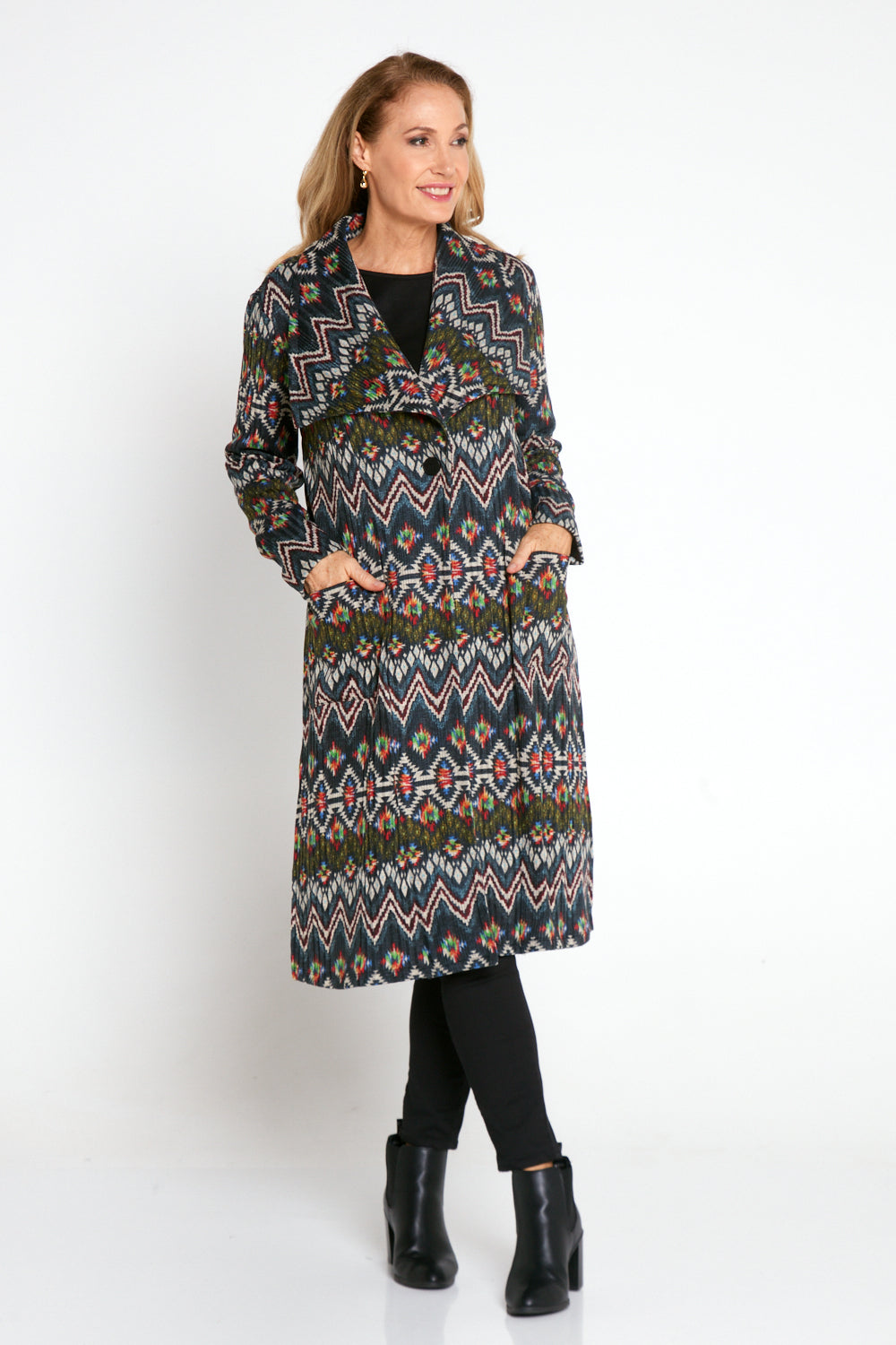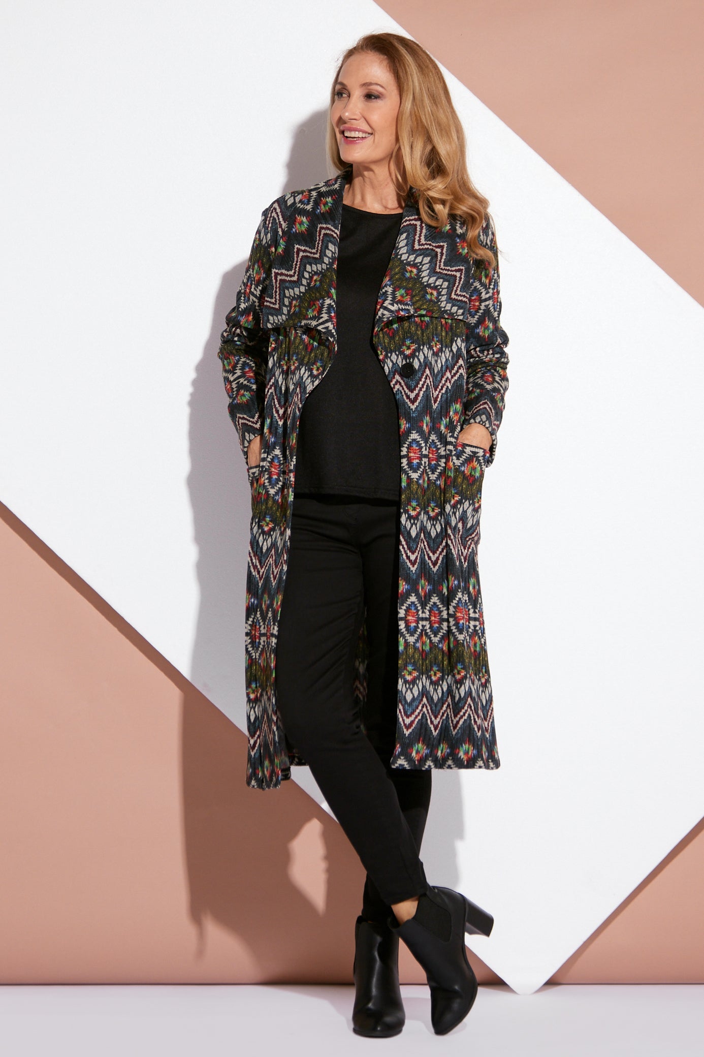 Lara Fleece Trench Coat - Navy Aztec