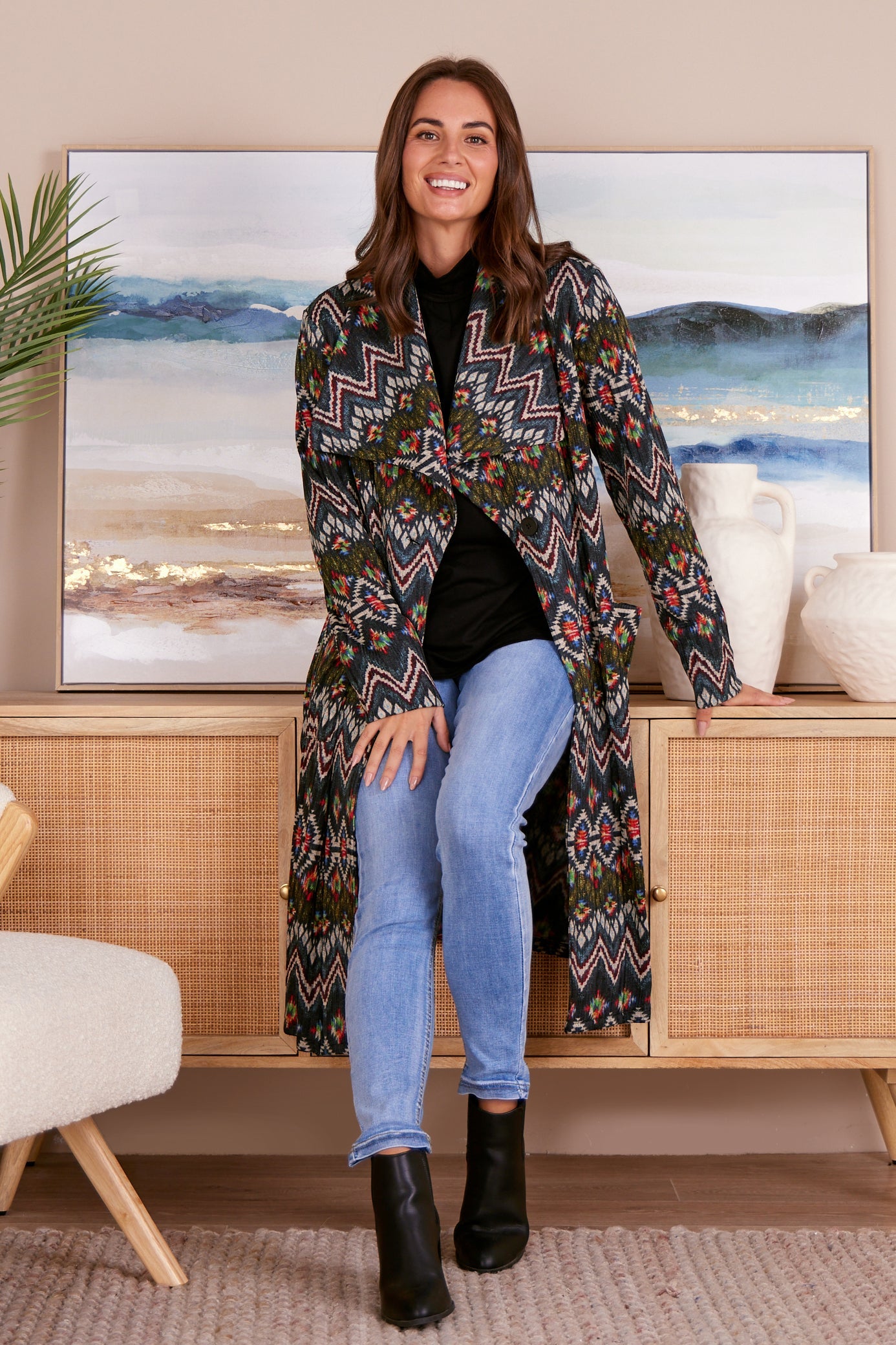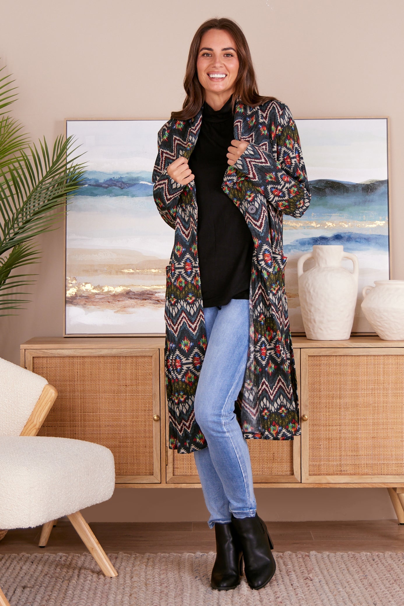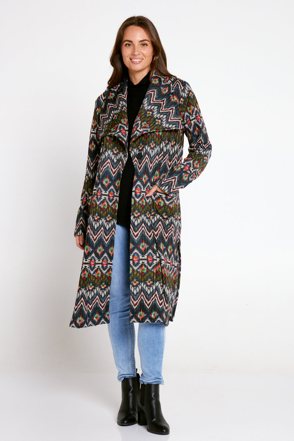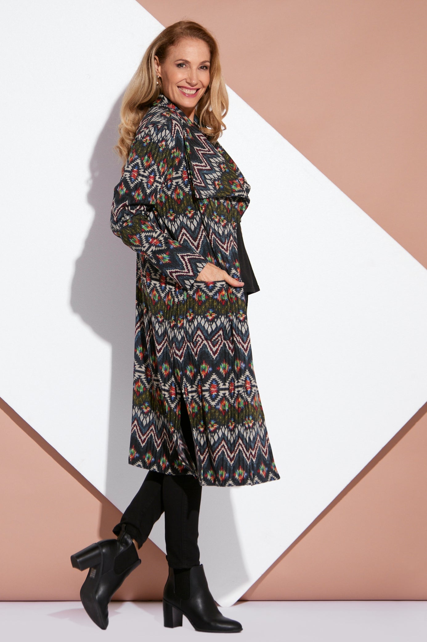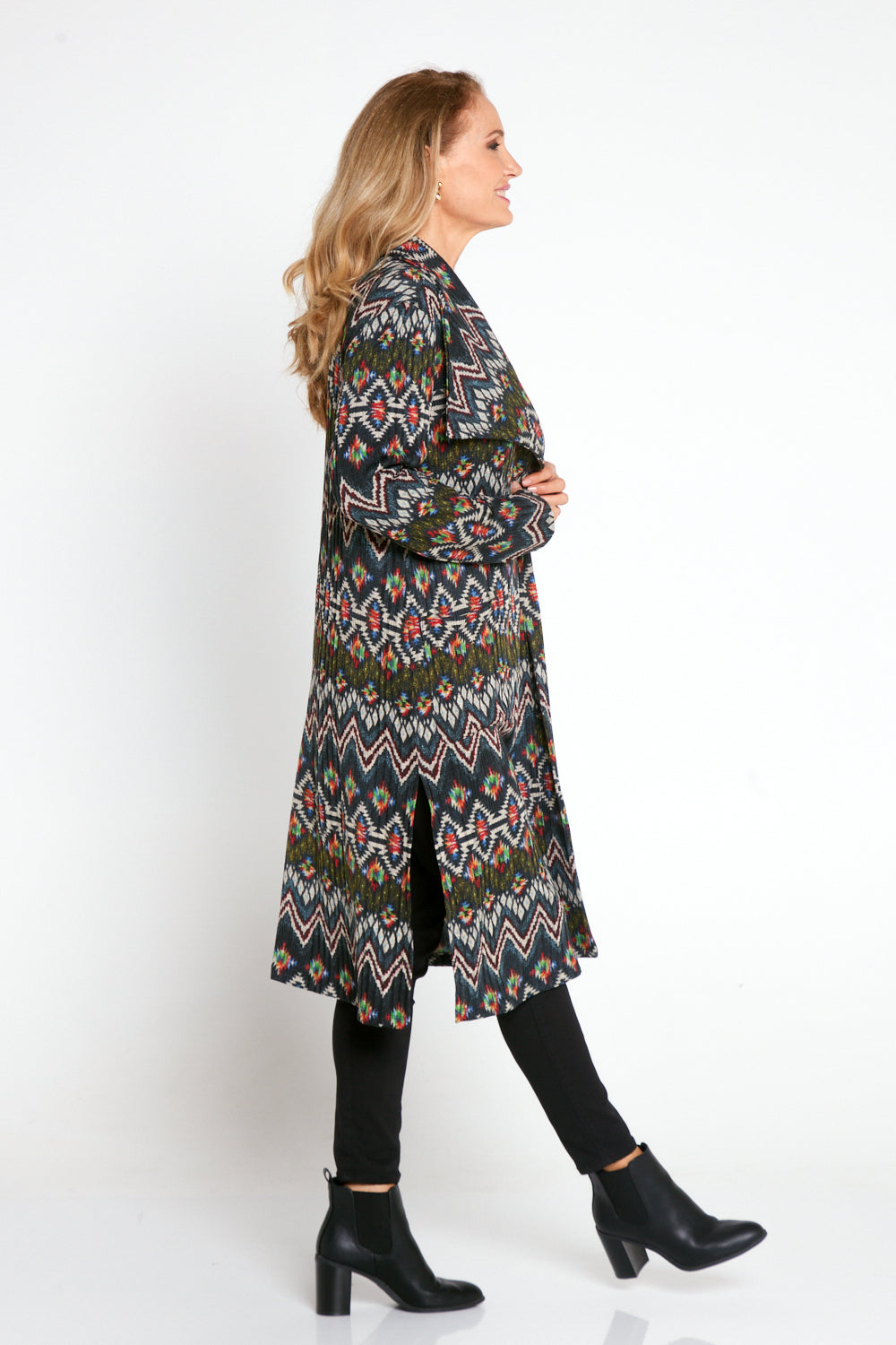 Lara Fleece Trench Coat - Navy Aztec