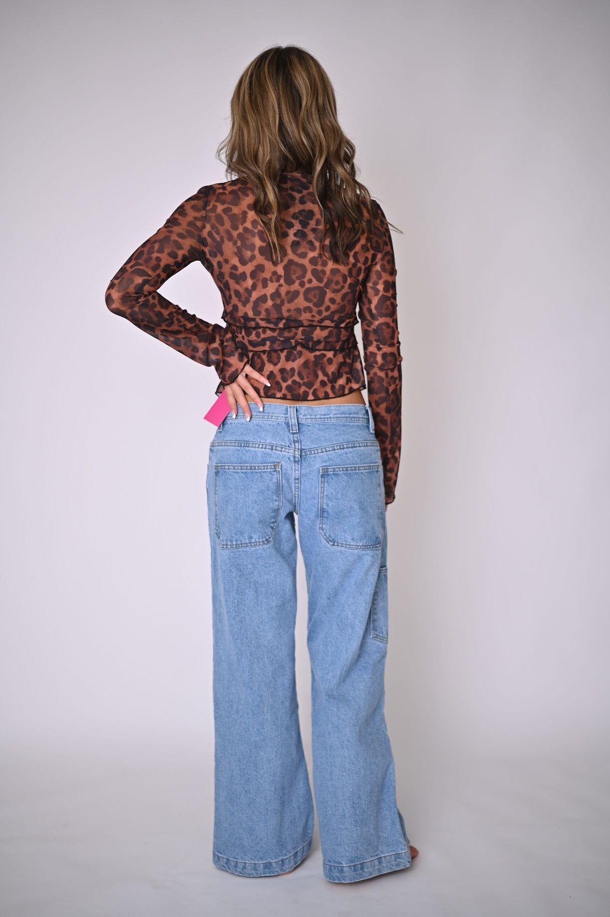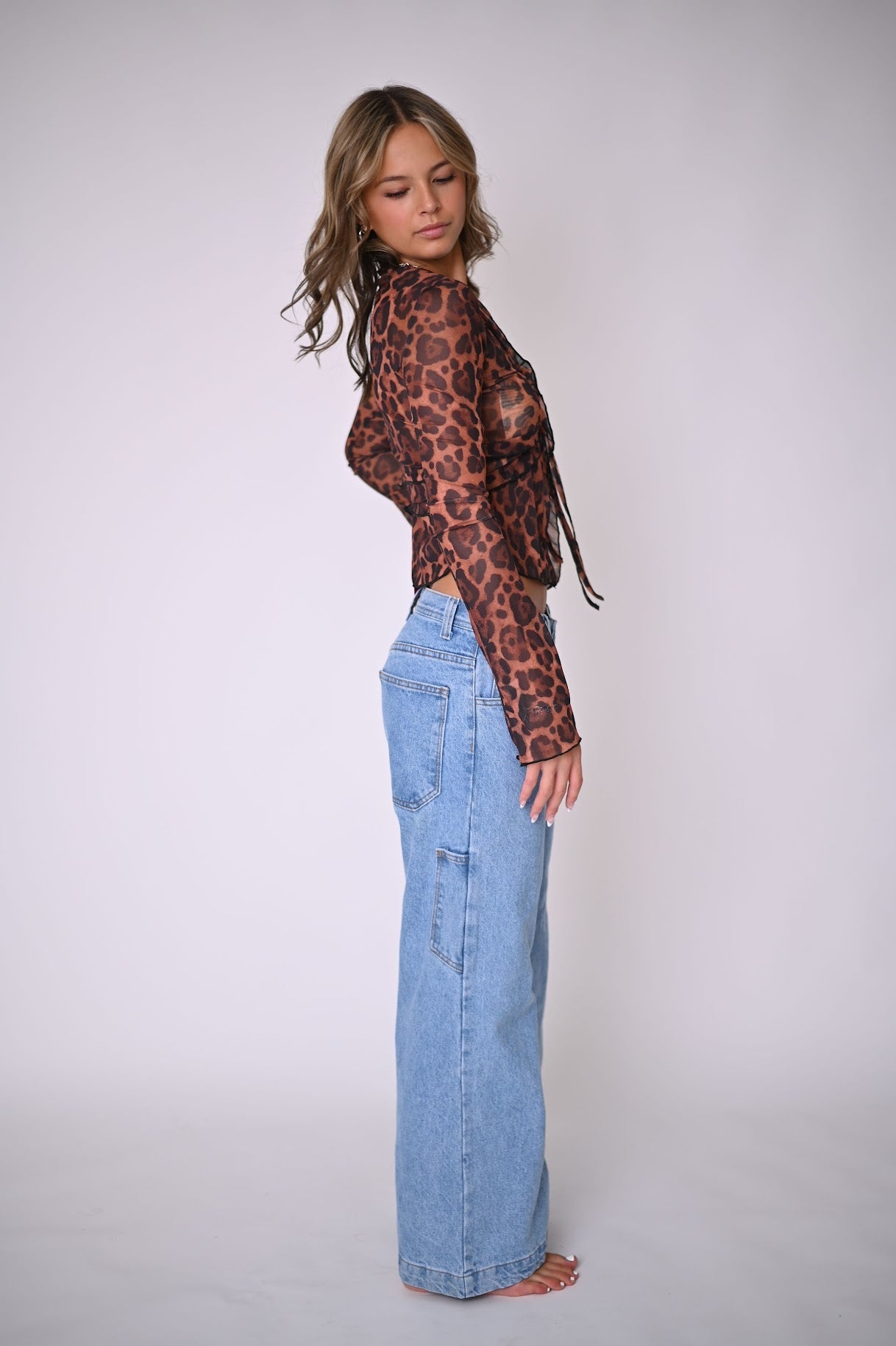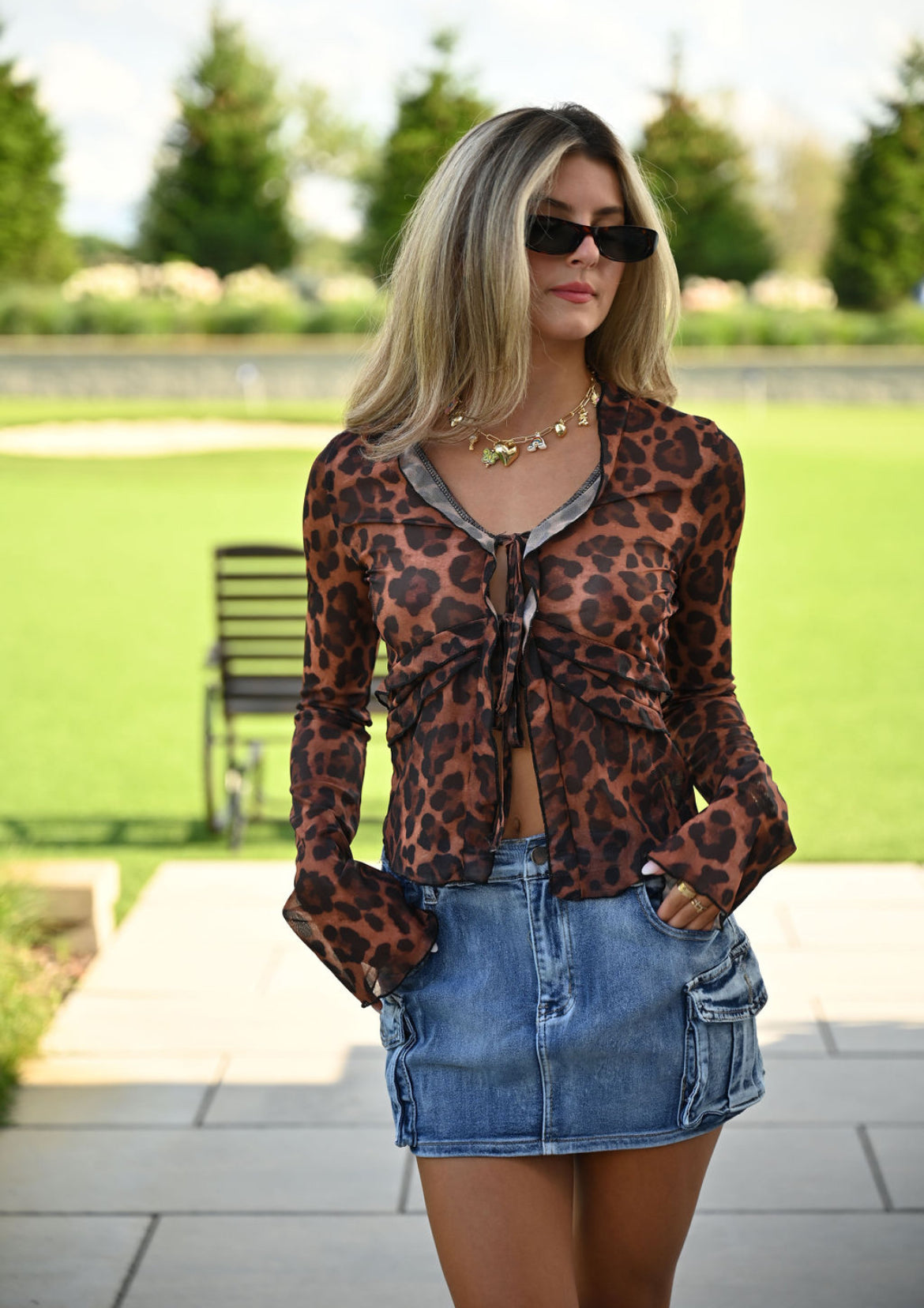 Unleash your wild side with this daring leopard print mesh top! Featuring a sultry tie-front design and long sleeves, this sheer top adds a bold touch to any outfit. Perfect for a night out, pair it with high-waisted jeans or a skirt for an edgy, fashionable look.