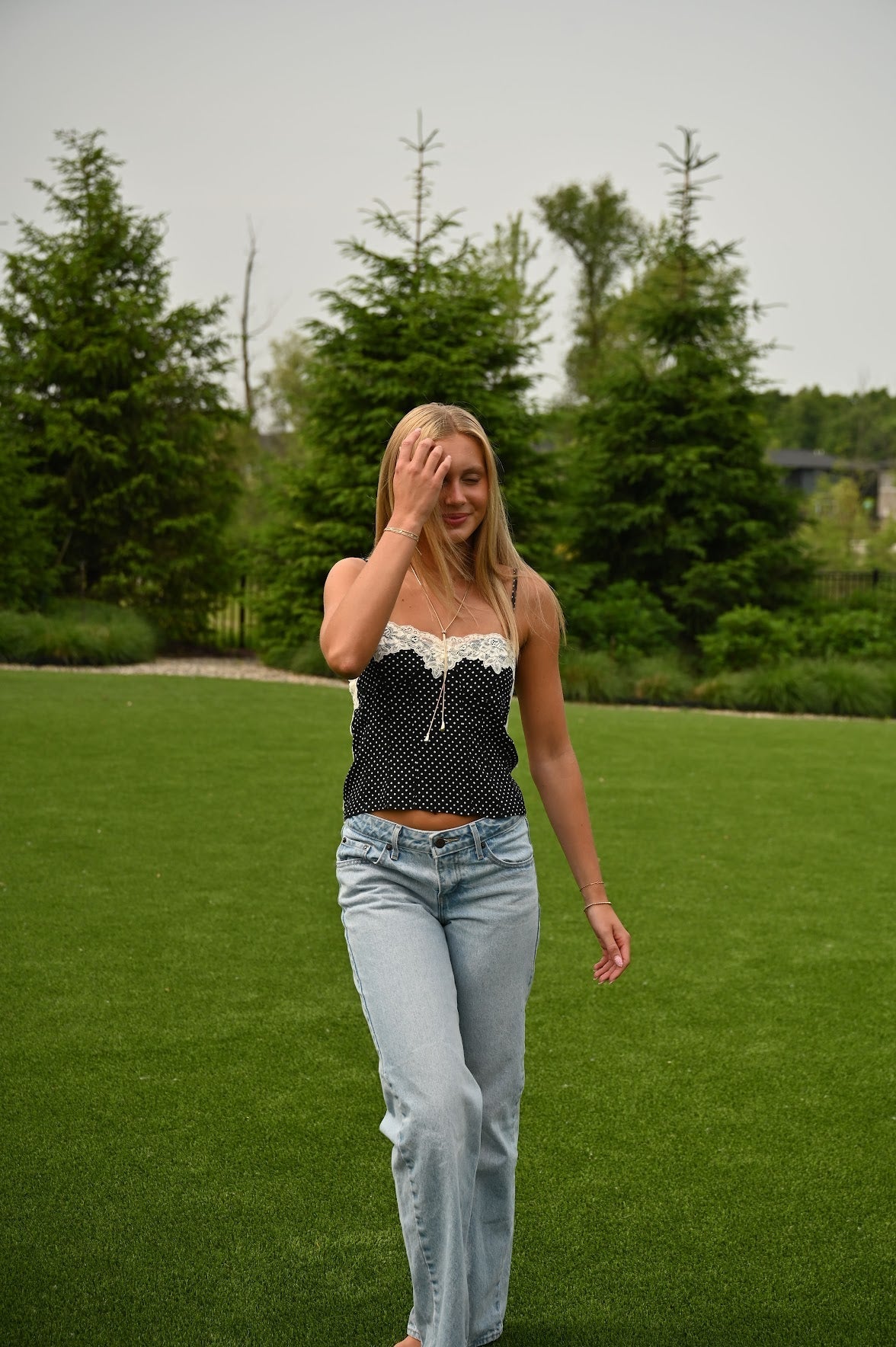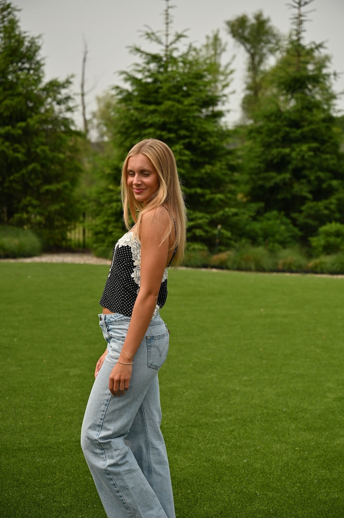 Add a touch of whimsy to your wardrobe with our Doll Top! This playful crop top features a delicate floral lace trim and playful polka dot pattern. The perfect addition to any outfit, it's sure to turn heads and make a statement (without taking itself too seriously).