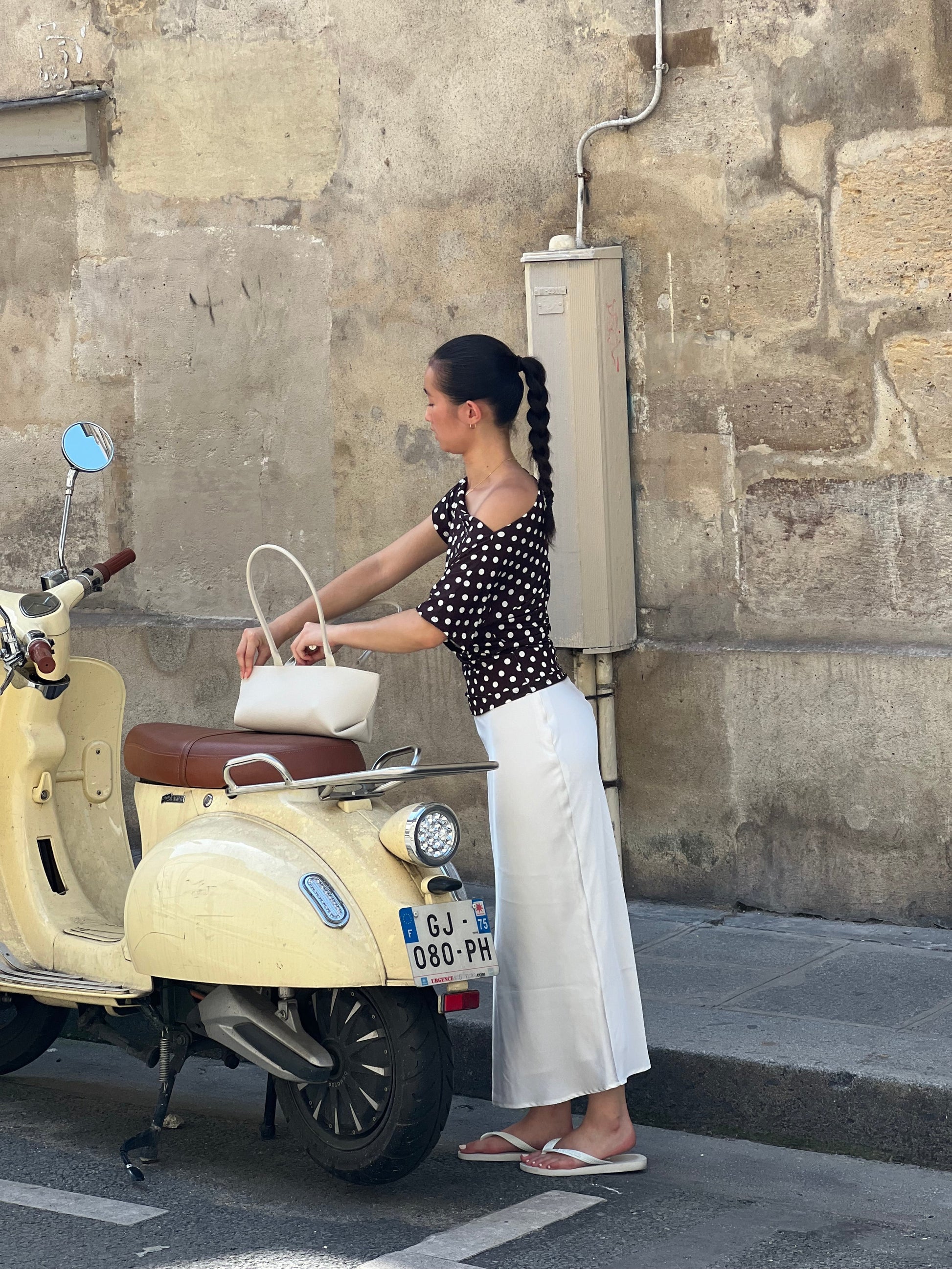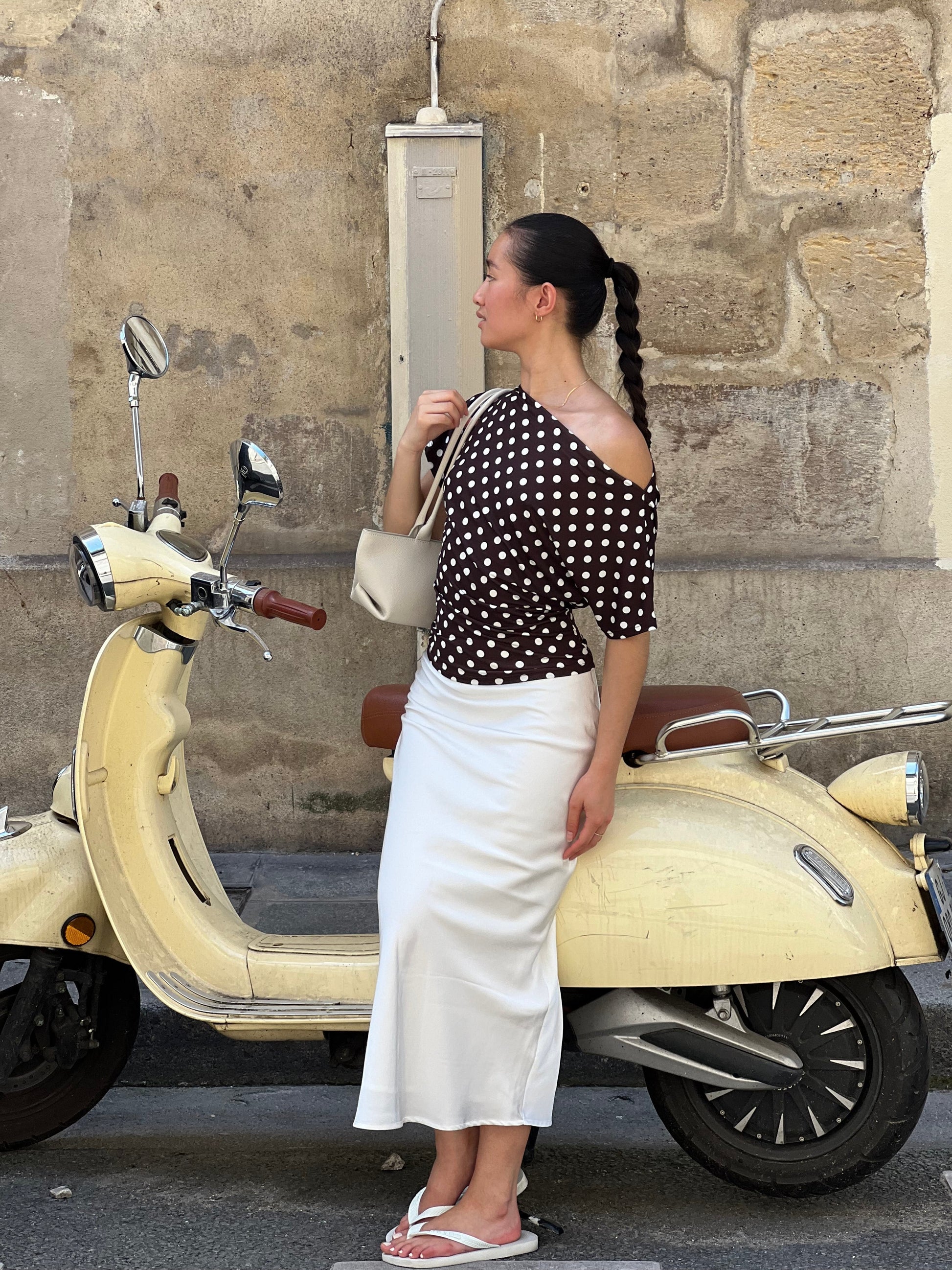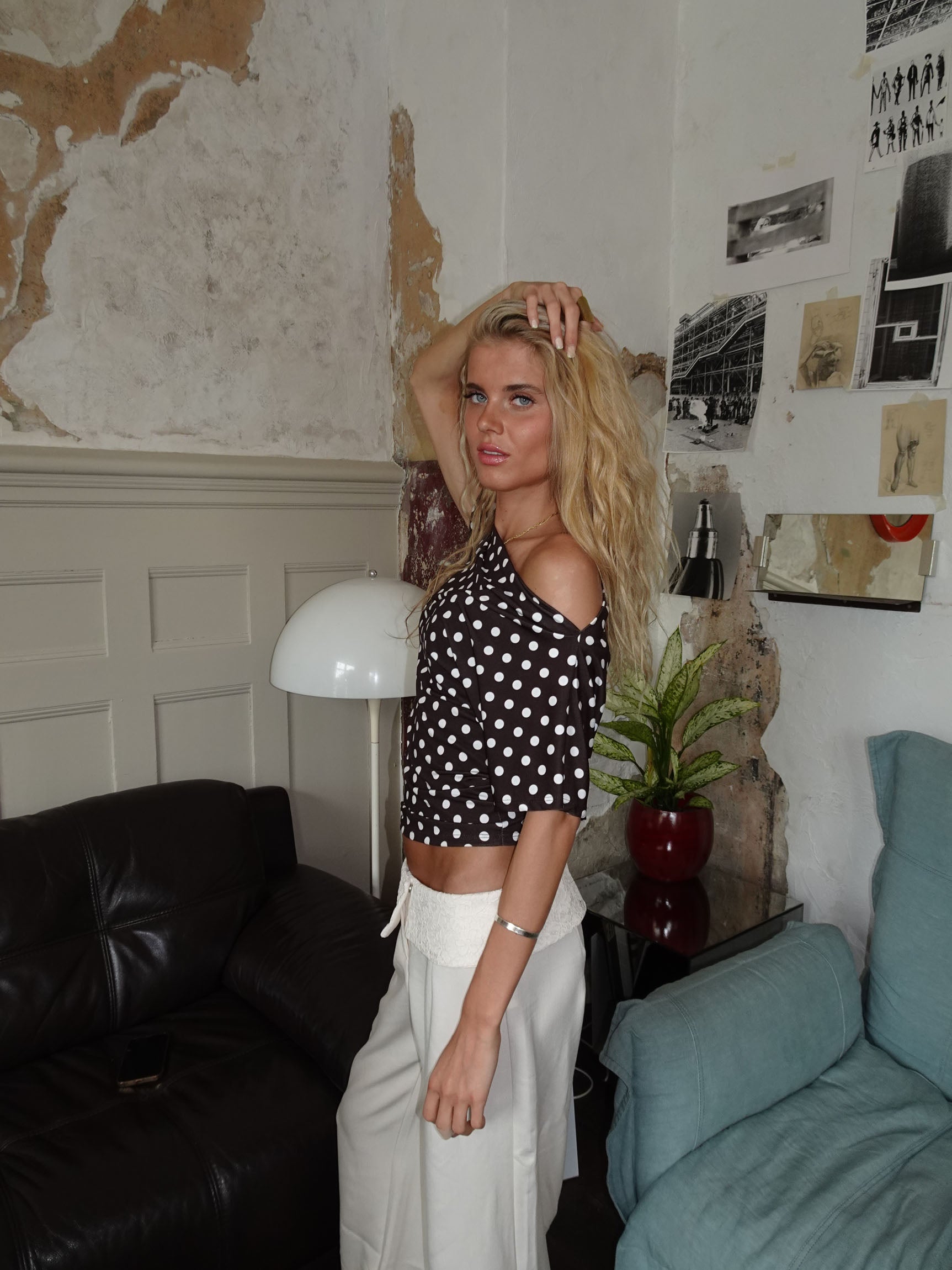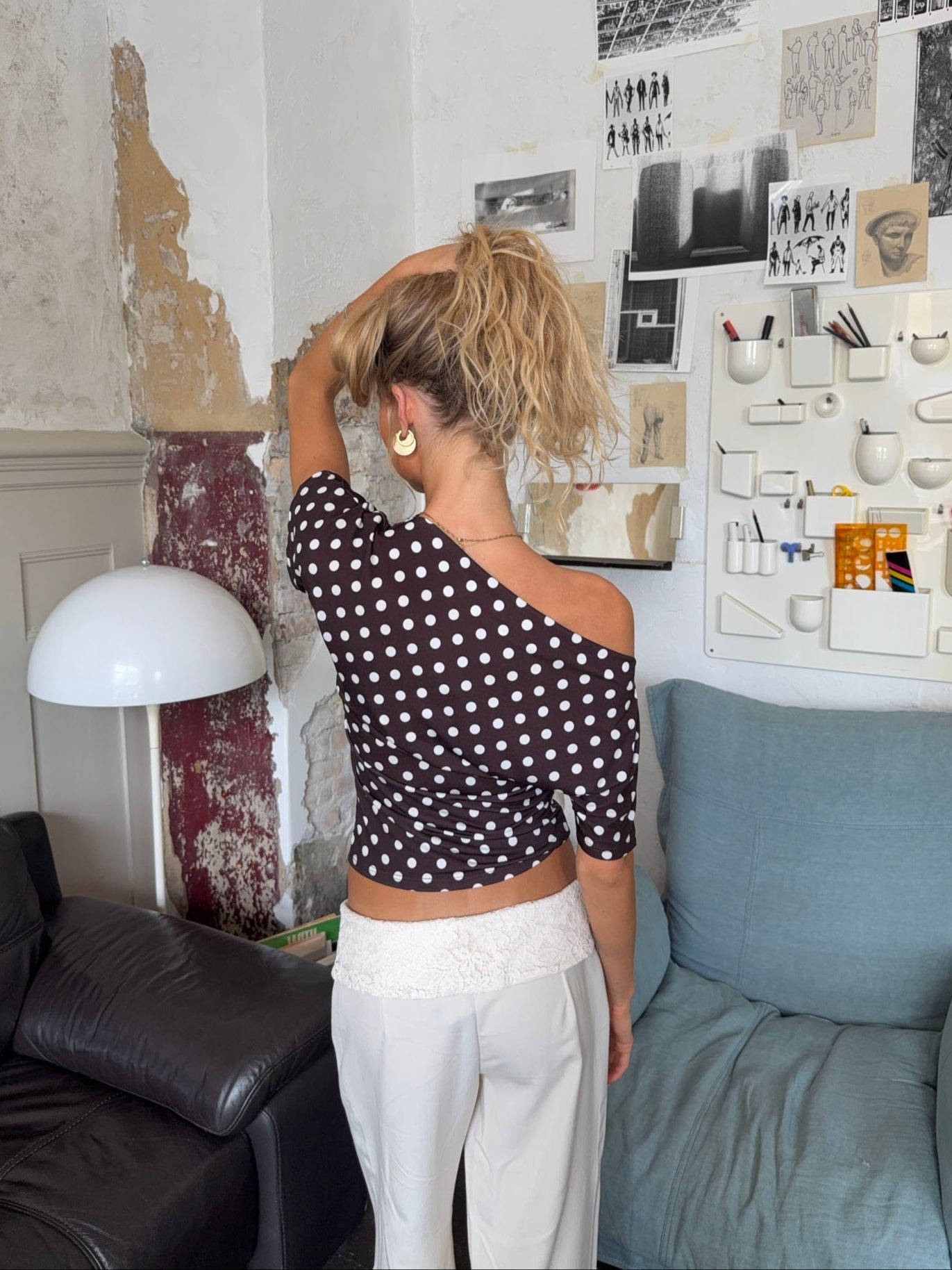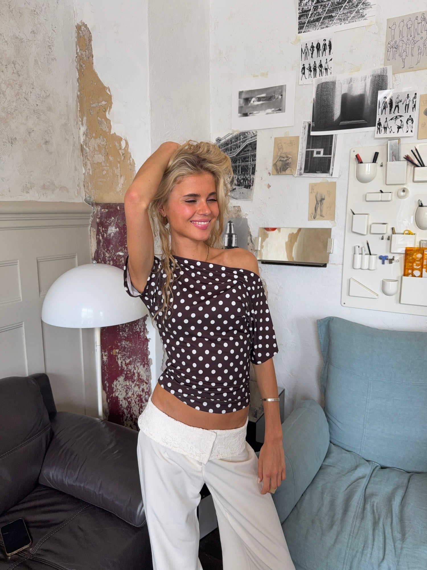 Our Florine t-shirt is both form-fitting and elegant. This version of the Florine features a beautiful polka dot print. The t-shirt exudes a simple yet sophisticated vibe, with a unique twist that makes it perfect for those seeking a classic look with an exclusive touch.