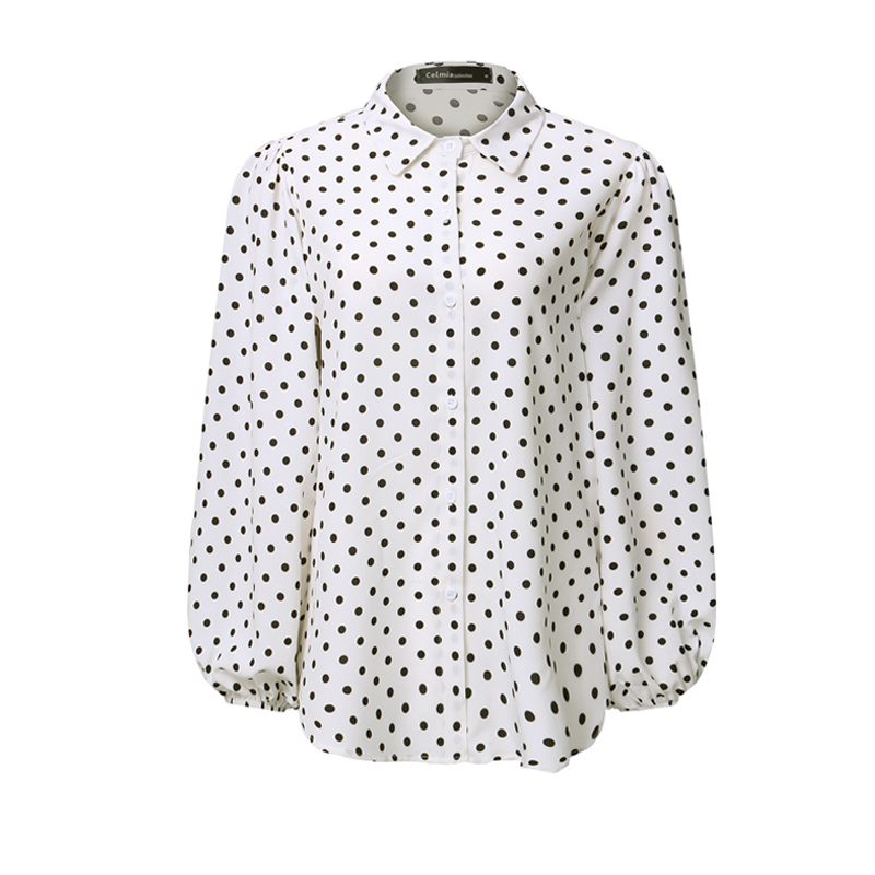 Lantern Sleeve Shirt with Polkadot Pattern, Turn Down Collar, and Single Breasted Closure