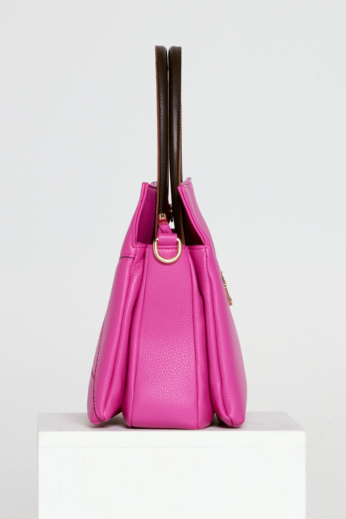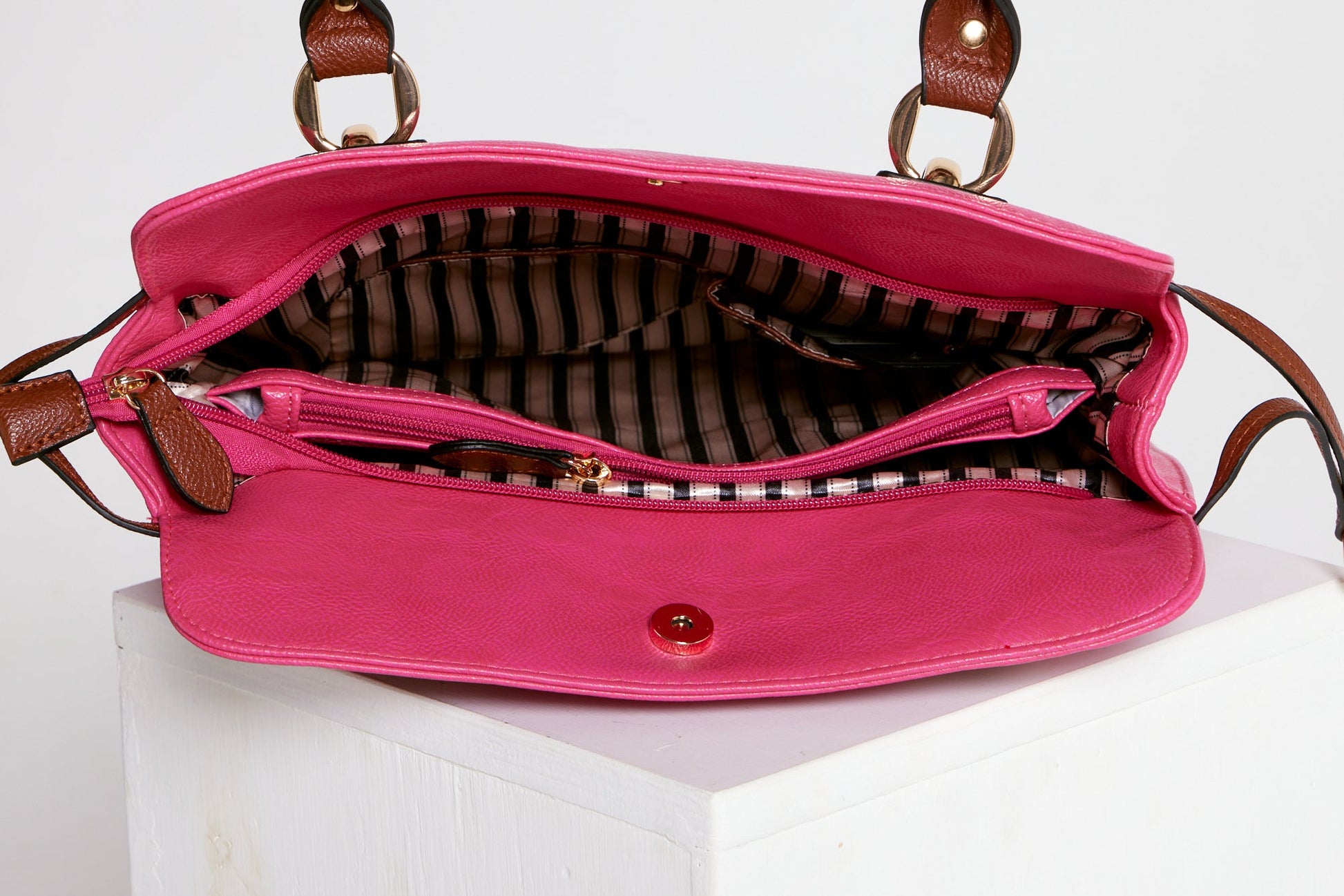 Don't just carry your stuff - make a bold statement with the Aquarius Tote Bag in Magenta! With accent panels and stitching, dark brown handles, and gold-toned hardware, this bag exudes adventure and style. Plus, with multiple compartments and a detachable shoulder strap, it's as functional as it is daring!