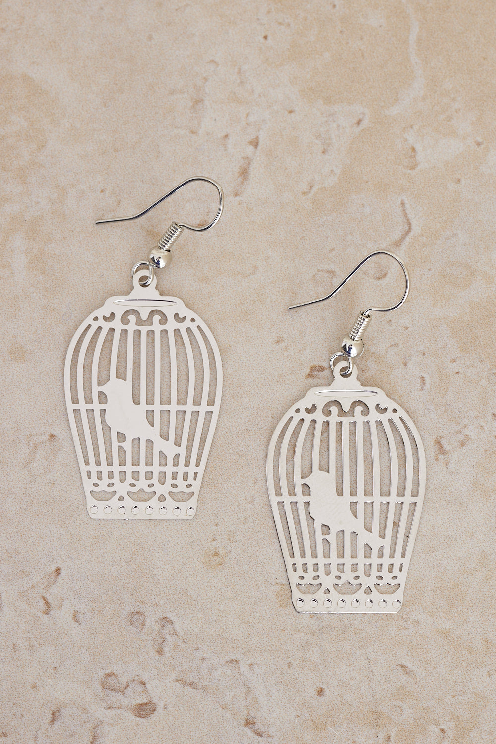 Embrace the charm of the Aviary Earrings in silver. These unique earrings feature a delicate birdcage design with a perched bird, intricately crafted from a polished silver-tone finish. The playful yet elegant motif adds a whimsical touch to your look, making these earrings perfect for any occasion. With a secure post-back closure and lightweight construction, they are designed for all-day comfort and style.