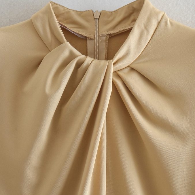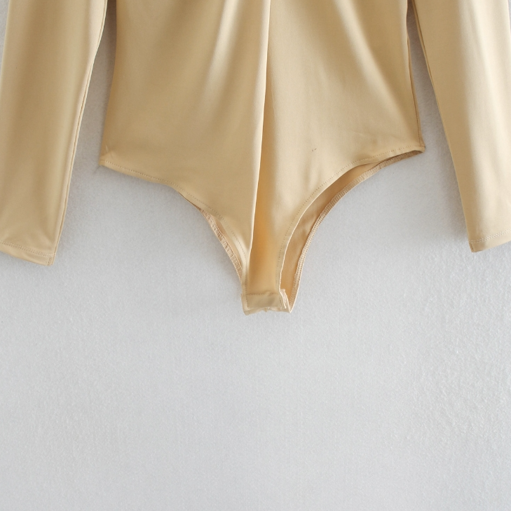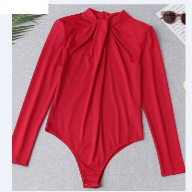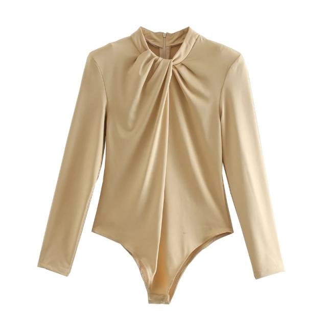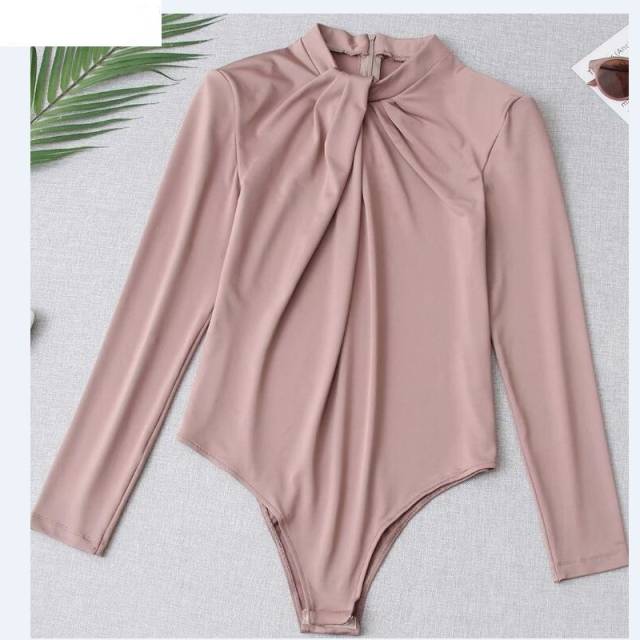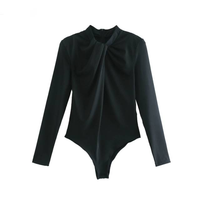 Solid Long-Sleeved Polyester Modal Rayon Bodysuit with Neck Pleated Style