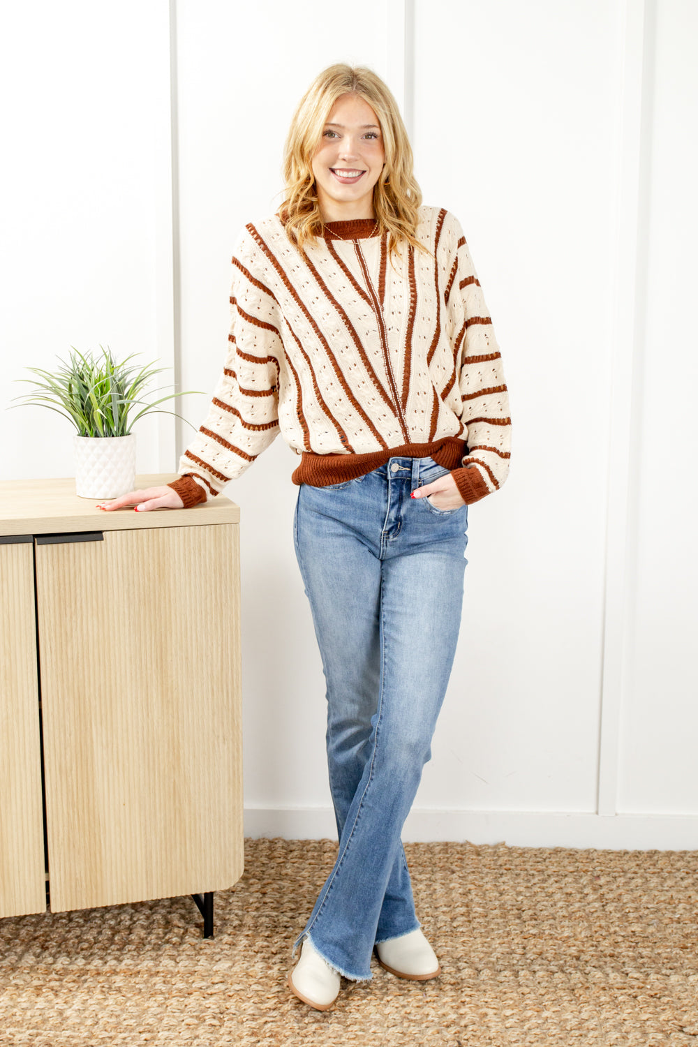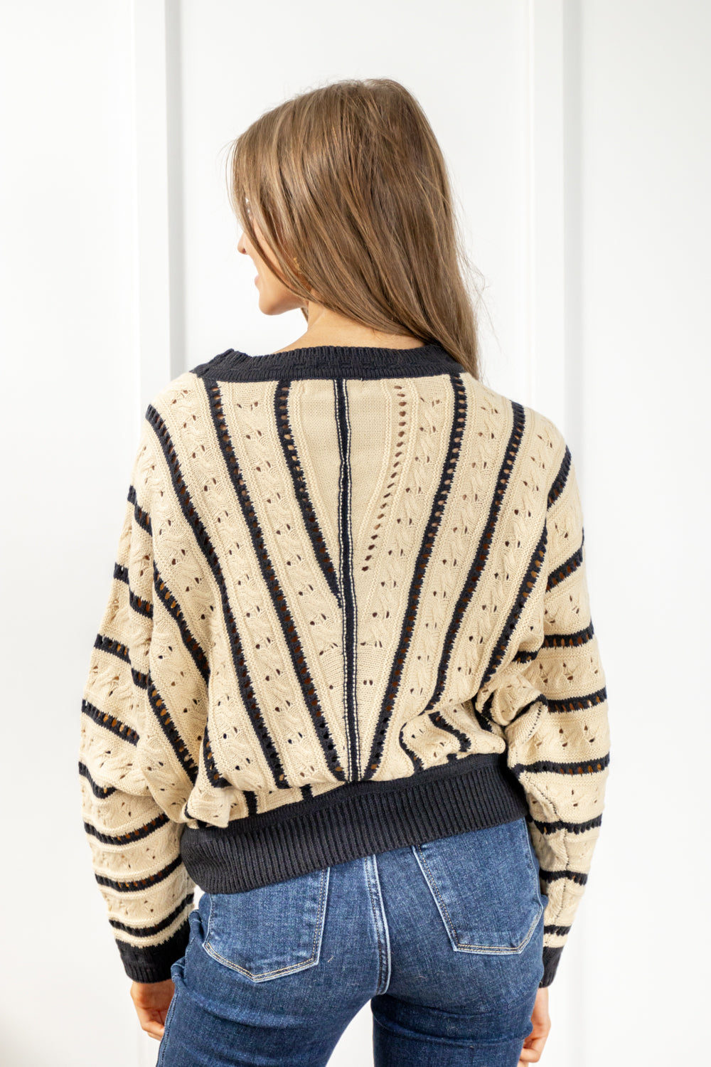This mid-weight sweater offers a stylish twist on classic comfort. The V-striped pointelle detailing and contrast color accents add visual interest, while the dolman sleeves and ribbed accents create a relaxed, flattering fit. Perfect for transitioning into cooler weather, this sweater will keep you cozy and chic all season long.