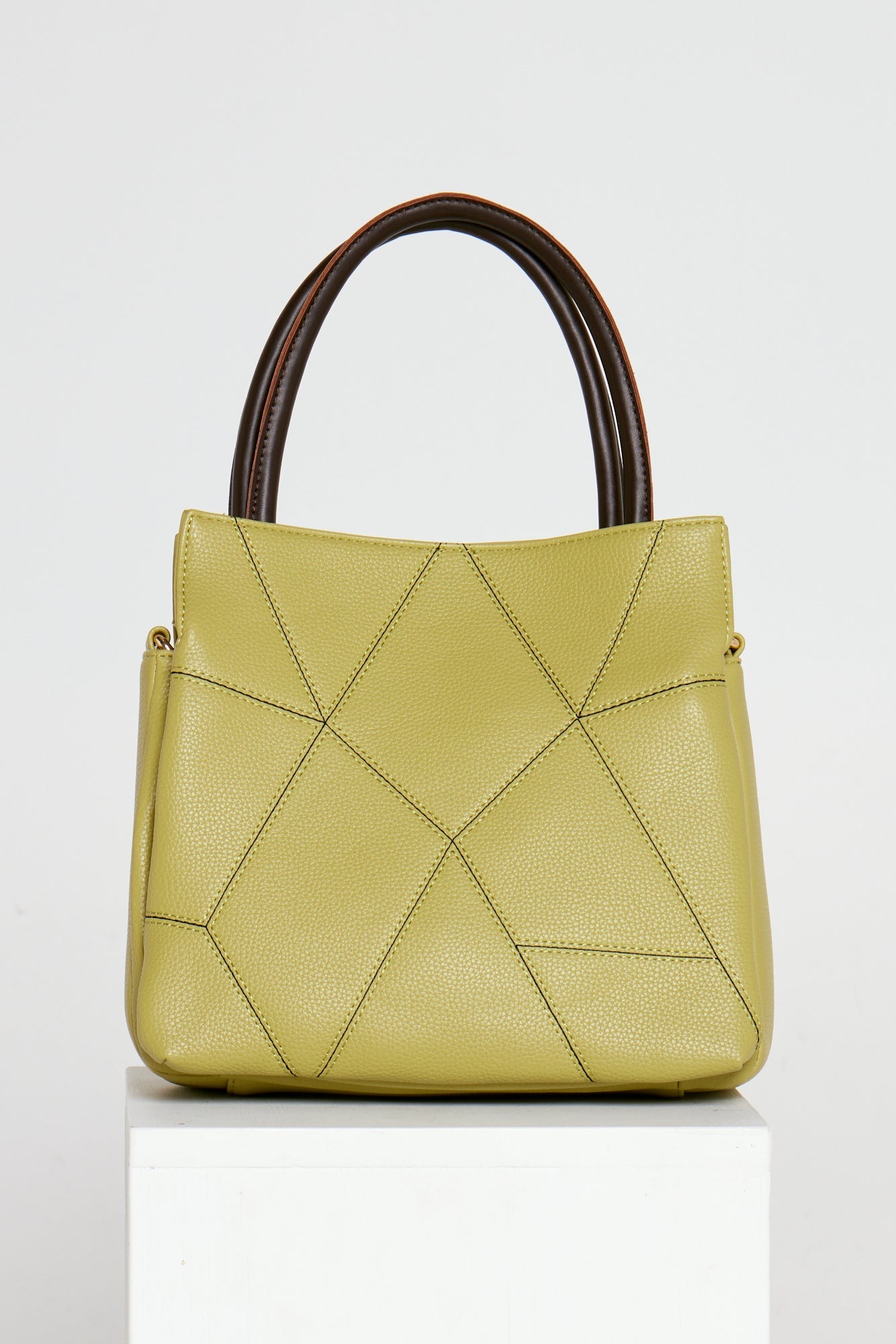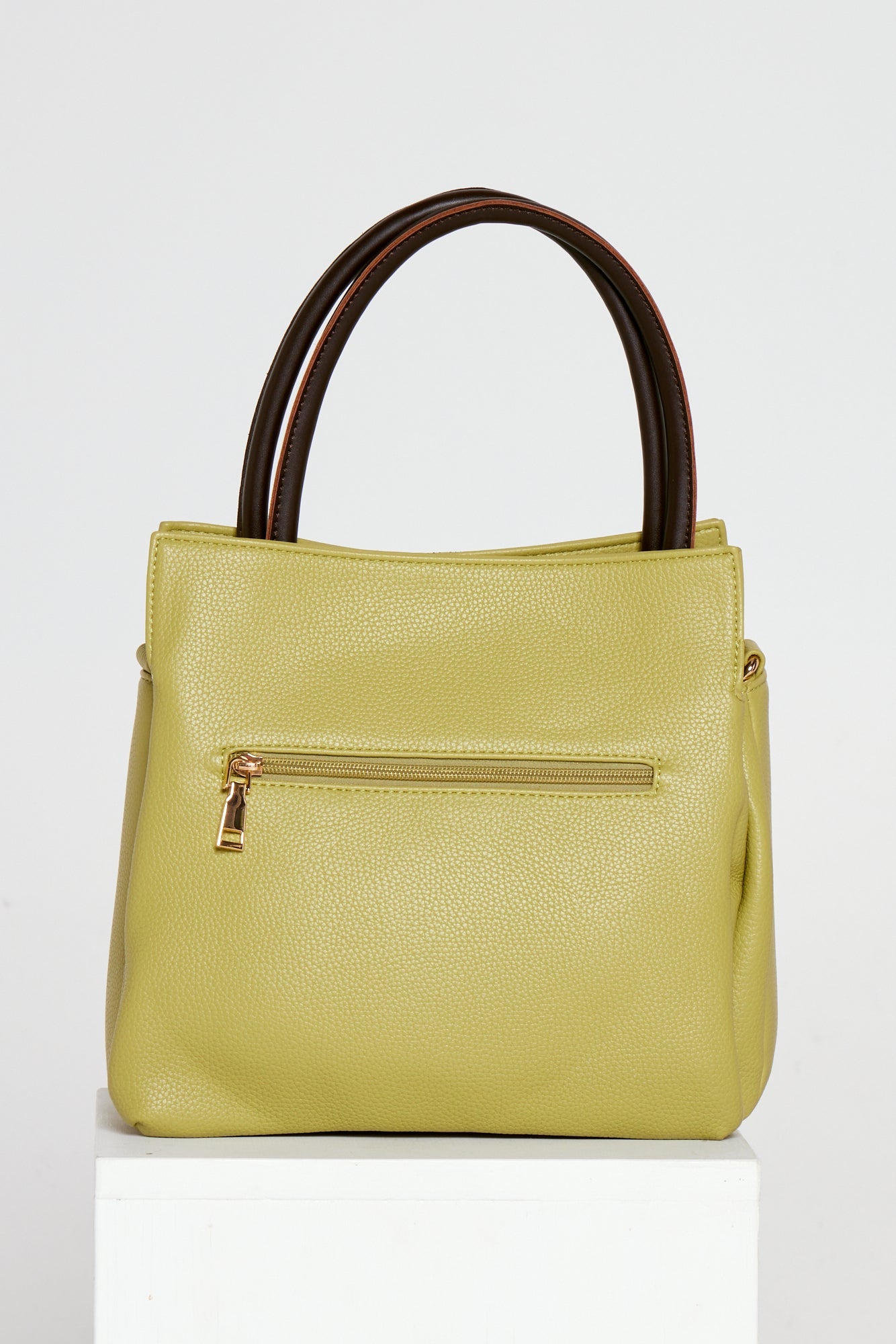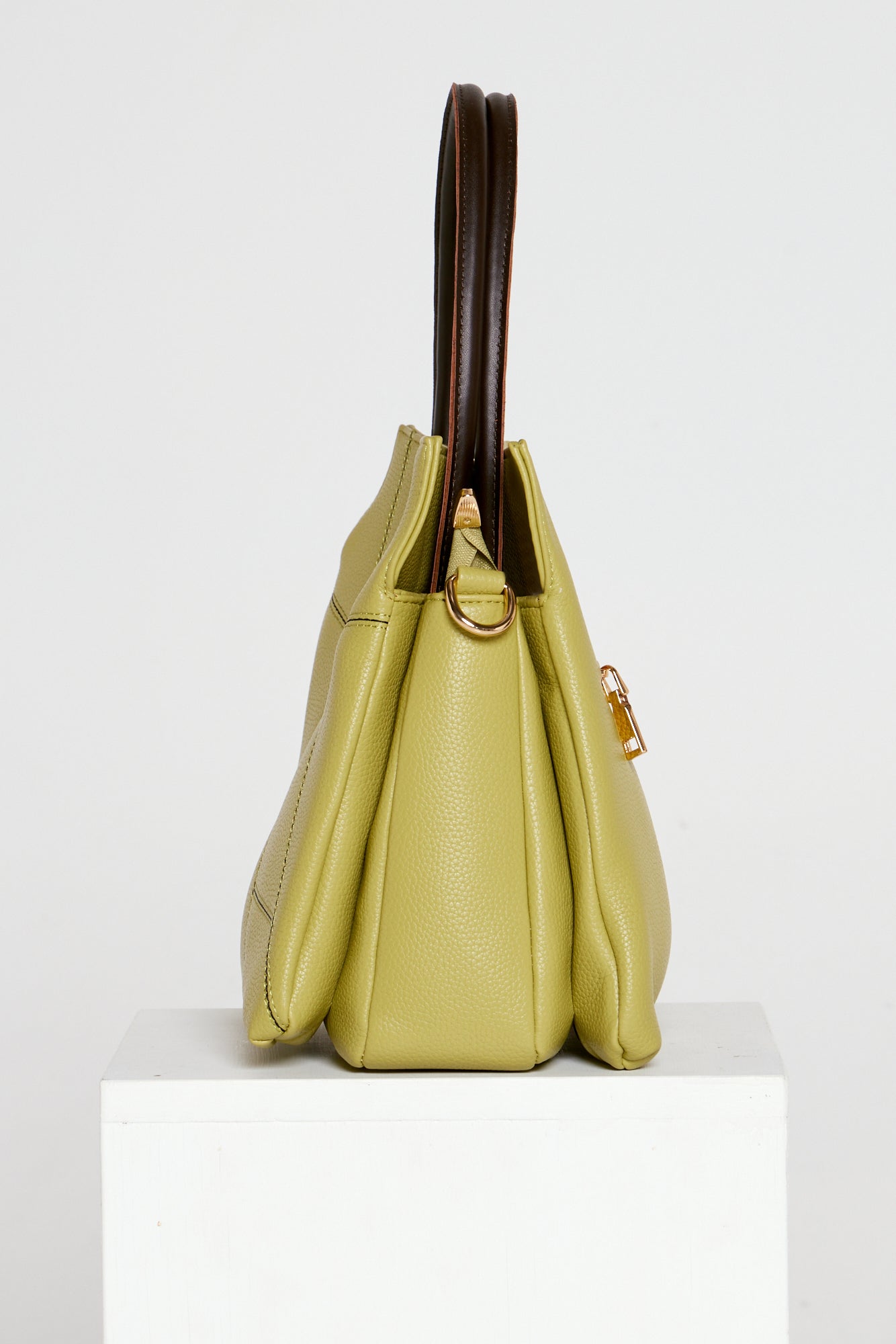 Get ready to add some spice to your wardrobe with our Aquarius Tote Bag in Wasabi! With accent panels and stitching on the front, dark brown tone handles, and a playful stripe pattern lining, this bag is both stylish and functional. The three main compartments, including a zip closure and inner pockets, make it easy to stay organized on the go. Plus, the long detachable shoulder strap adds extra convenience. Say goodbye to boring bags, and hello to Aquarius!
