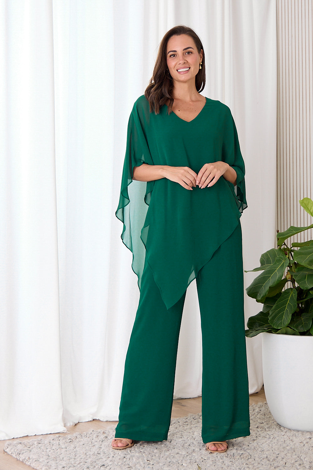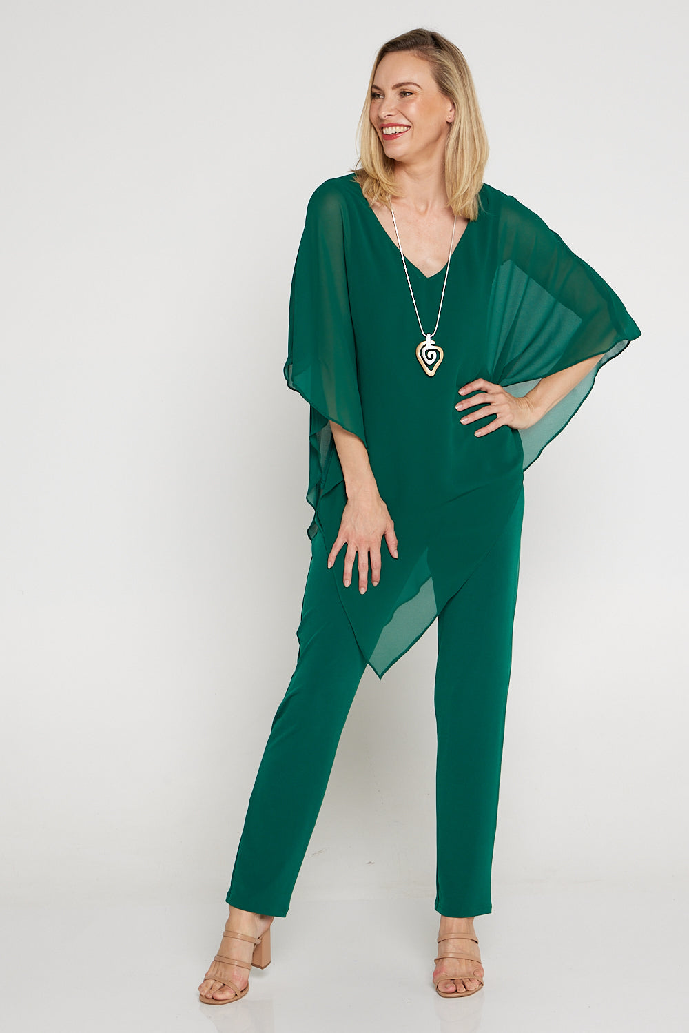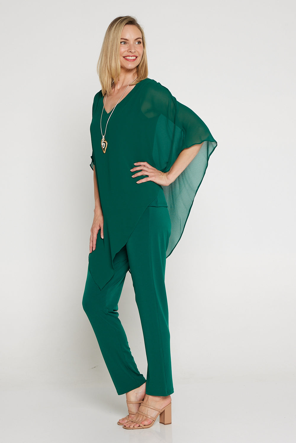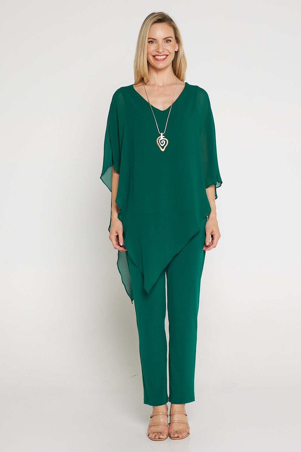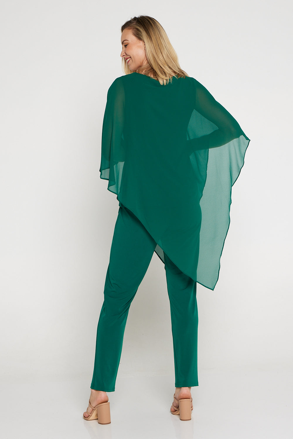 The Aubriella Top now comes in a sophisticated forest green. Exceptionally elegant, the Australian made Aubriella Top is perfect for the evening. Simple in its construction, it consists of a jersey underlay, with a floating chiffon overlay that drapes to a point to one side. This also allows you to tie the points together, to create a different look.