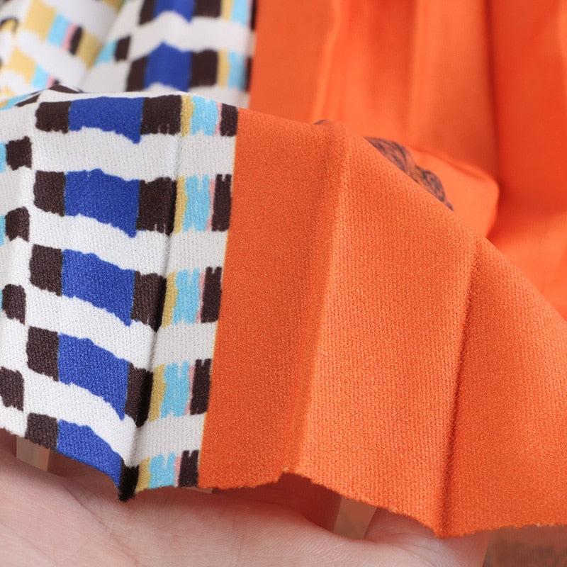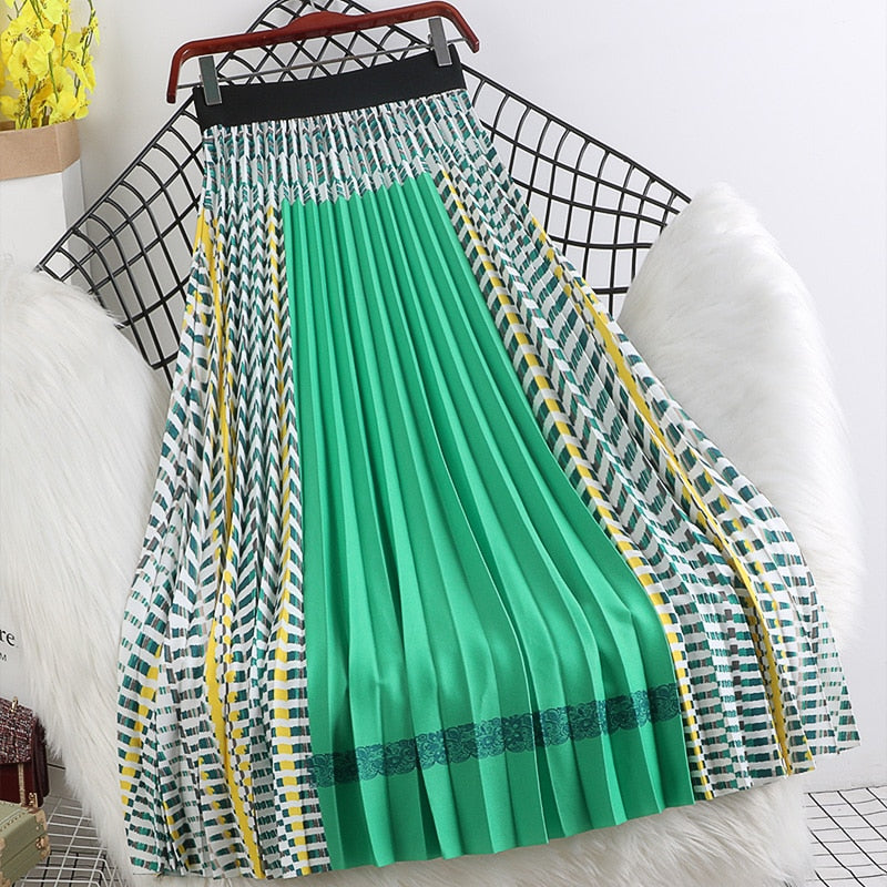Pleated Cotton Polyester Midi Skirt with Elastic Waist and Geometric PatternĀ