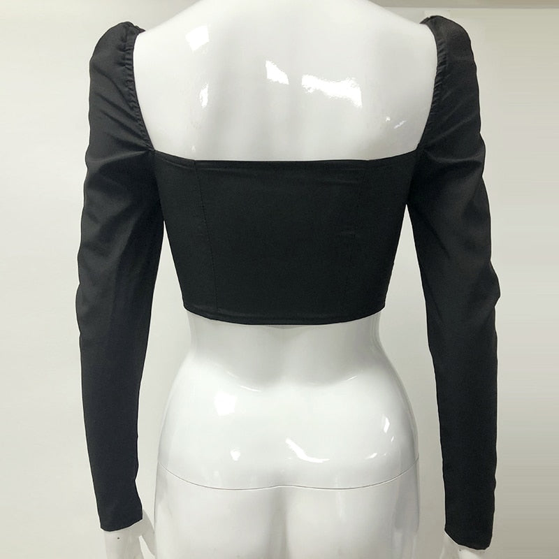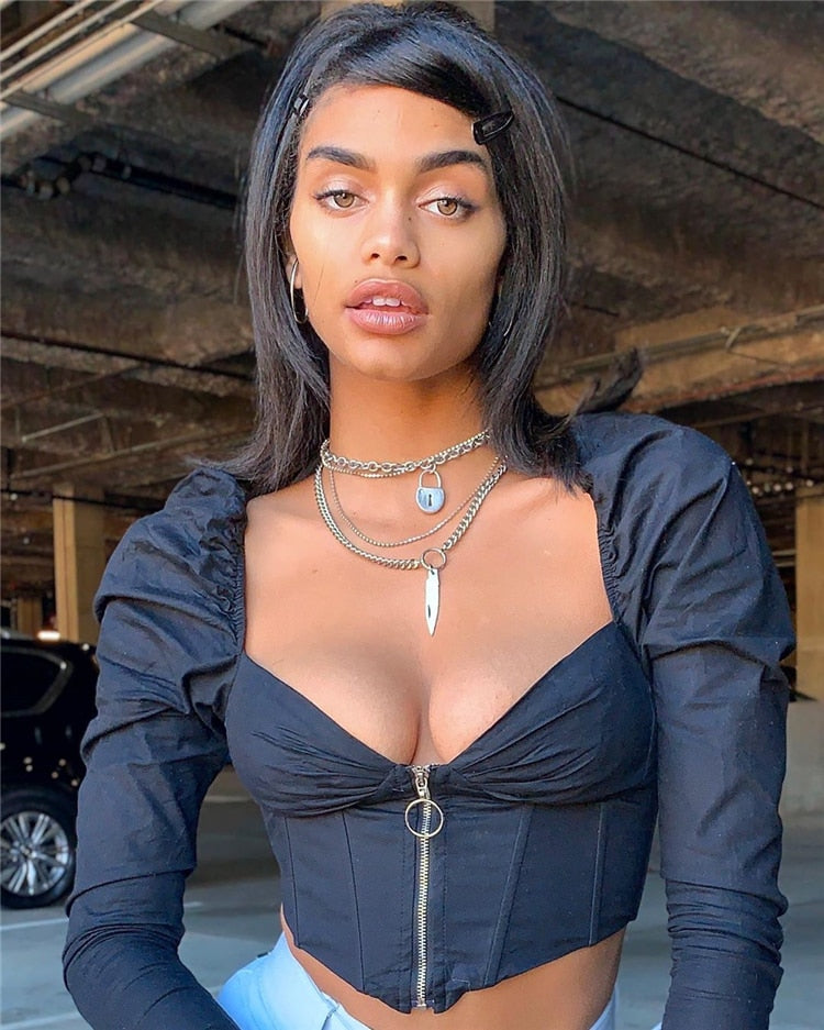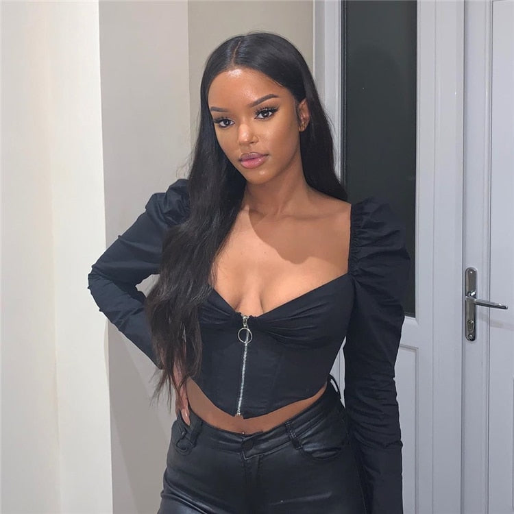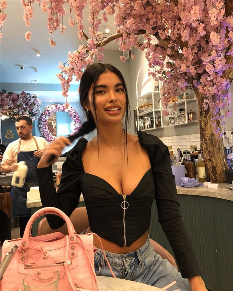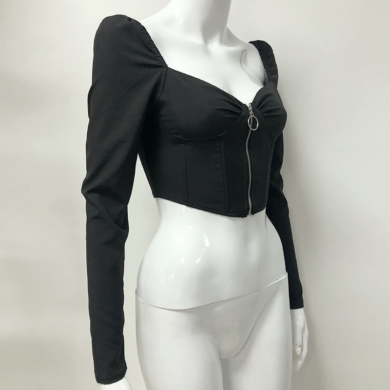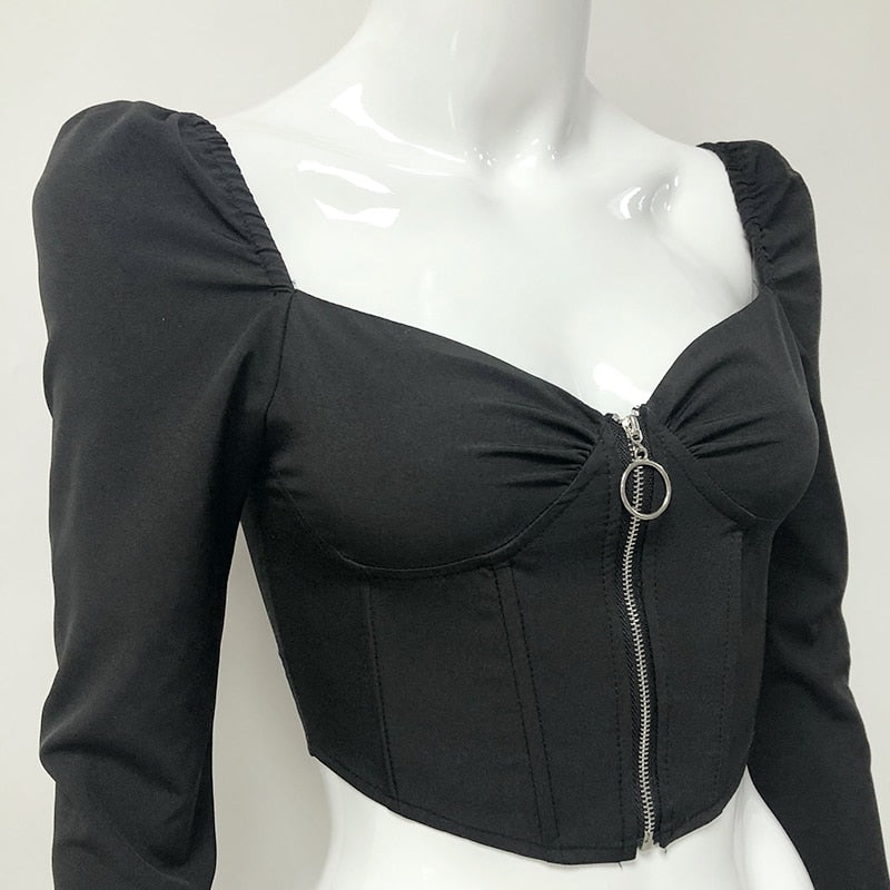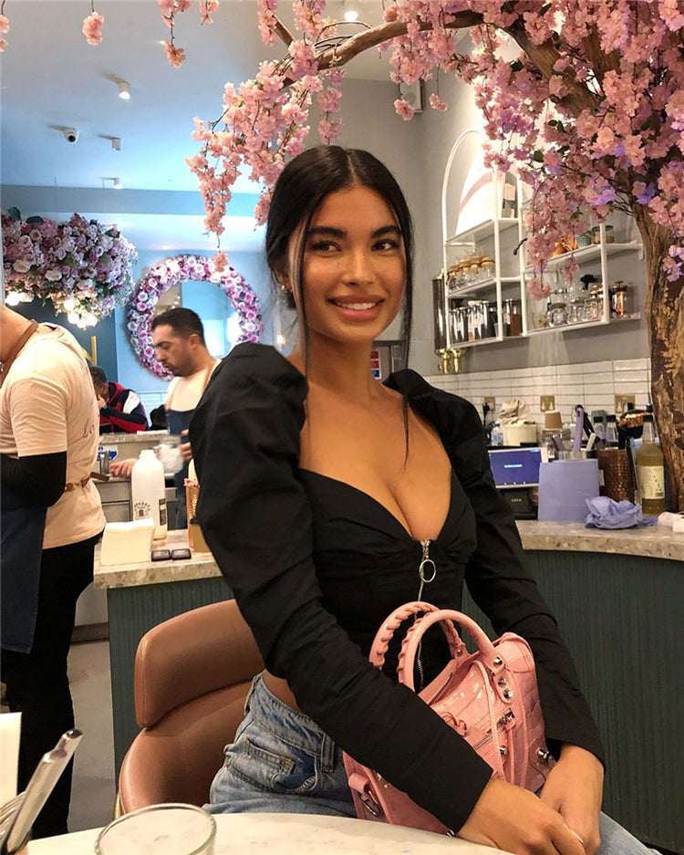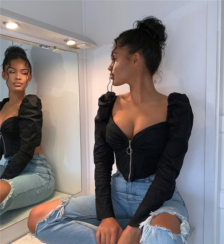 Vintage V-Neck Front Zipped Boned Long Puff Sleeve Top